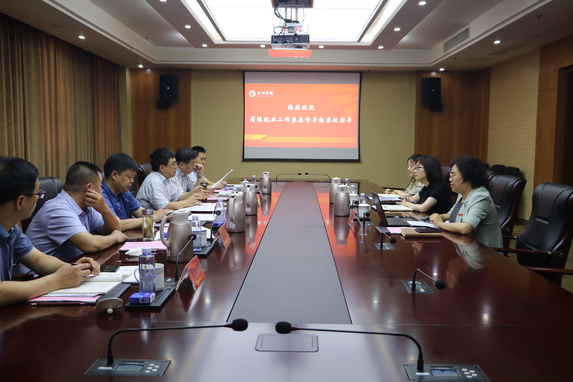 7月26日上午,江苏省稳就业工作来泰督导组到bat365督查指导就业工作。省人社厅农民工作处处长陈汝军担任督查组组长,省人社厅农民工作处二级调研员刘革、省人社厅农民工作处干部徐昌竞担任组员。市人社局副局长黄东平、市人社局就管中心副主任乔东方、市人社局人才中心副主任张德荣陪同督查。校党委常委、副校长卜慧芬出席就业工作专项督查汇报会,学工处相关负责人参加会议。