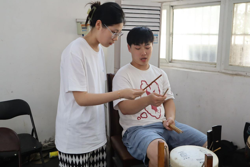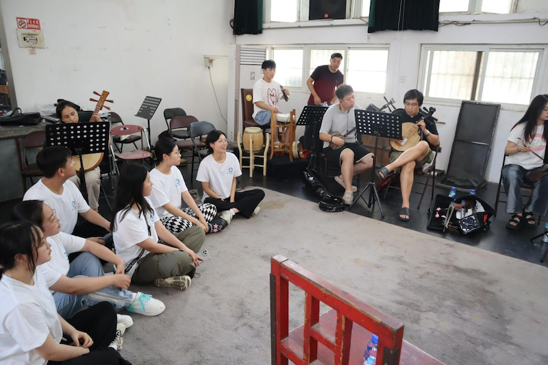 下午,团队继续深入排练现场。剧团乐队老师向队员们介绍“场面”(京剧的伴奏乐队)的组成,有京胡、京二胡、月琴、小三弦、单皮鼓、大锣、铙钹等,并指导大家学习单皮鼓的演奏技巧。排练现场如火如荼,《三击掌》《红娘》《遇皇后》等经典剧目一一呈现。休息之余,同学们向杨淅老师请教关于不同门派演唱技巧等问题,杨老师通过现场教学,使大家对梅派与程派两种唱腔有了进一步了解。