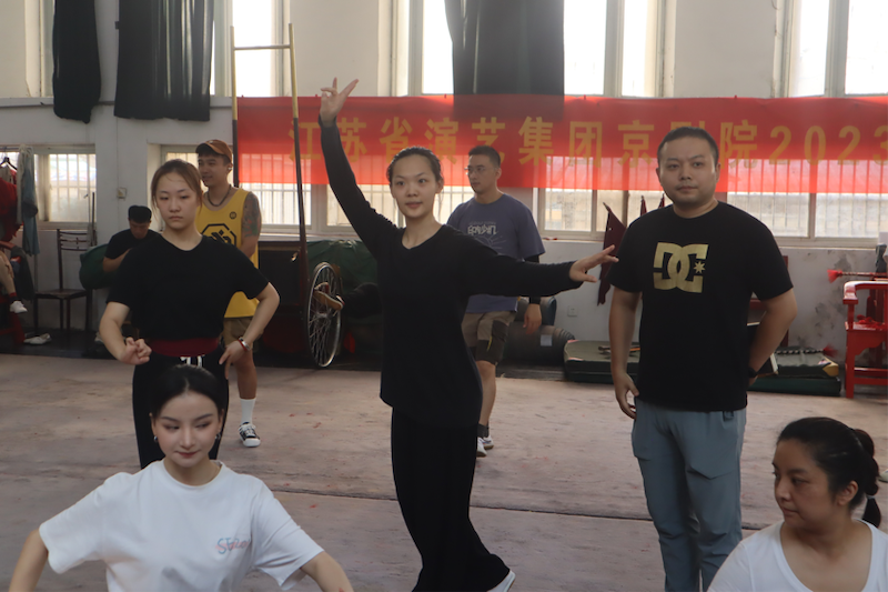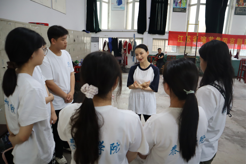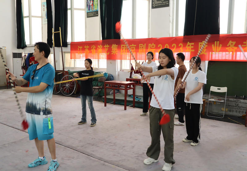 8月12日上午,实践团队来到江苏省演艺集团京剧院开展调研活动。江苏省演艺集团京剧院始建于1960年,曾被文化部评为“国家级重点京剧院团”,是中国南方实力雄厚的京剧表演艺术团。队员们通过观看《女杀四门》《霸王别姬》的排练,了解到京剧不同的表演形式及艺术特征。随后,李舒团长带领大家学习京剧基本动作“提枪花”。