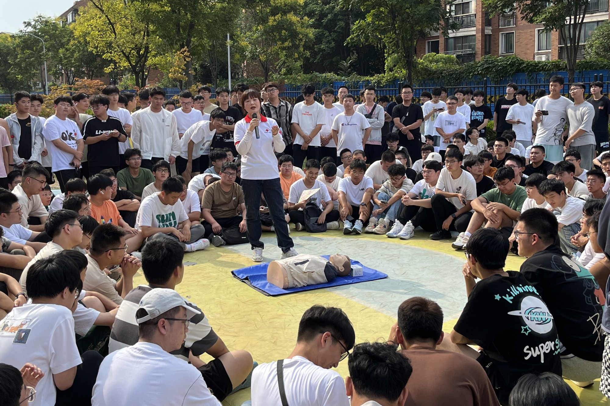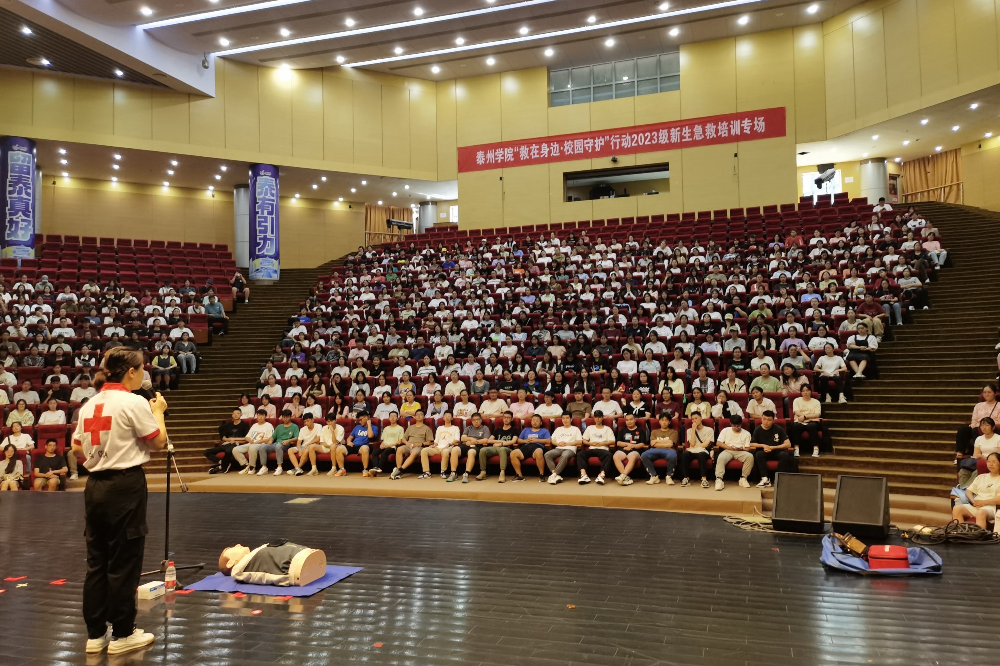 活动邀请了海陵区红十字会的急救培训师主讲。参训学生在老师的悉心教导下接受了一系列的应急救护实训,包括现场模拟演示和实际操作等。培训内容覆盖了基本生命支持、止血处理、骨折与伤口包扎、心肺复苏等急救技巧。经验丰富的讲师团队针对不同的应急情况进行细致讲解,并亲自示范操作,引导学生们正确掌握技能。培训现场,新生们全身心地投入其中,积极参与讨论和互动,部分新生上台进行了实操。