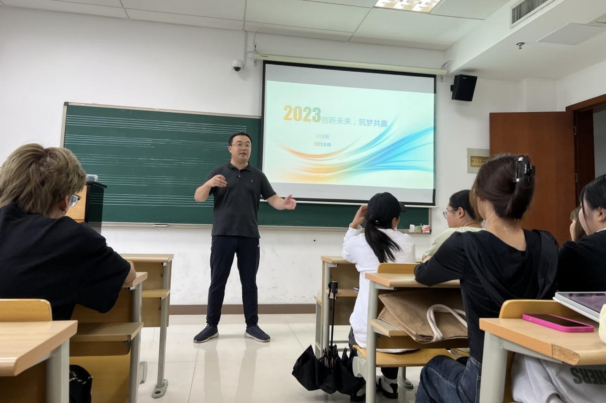 孙远纲首先从后疫情时代家长观念变化、信息化对行业的冲击、国家相关政策变化等角度分析了当前艺术培训行业的就业、创业形势,并就如何应对当前严峻的就业形势给出了积极的建议。孙远纲结合自己的创业经历,分享了自己成长故事,并鼓励同学们从实习开始,善于观察、善于学习、善于积累,树立职业自信,提升职业素养。