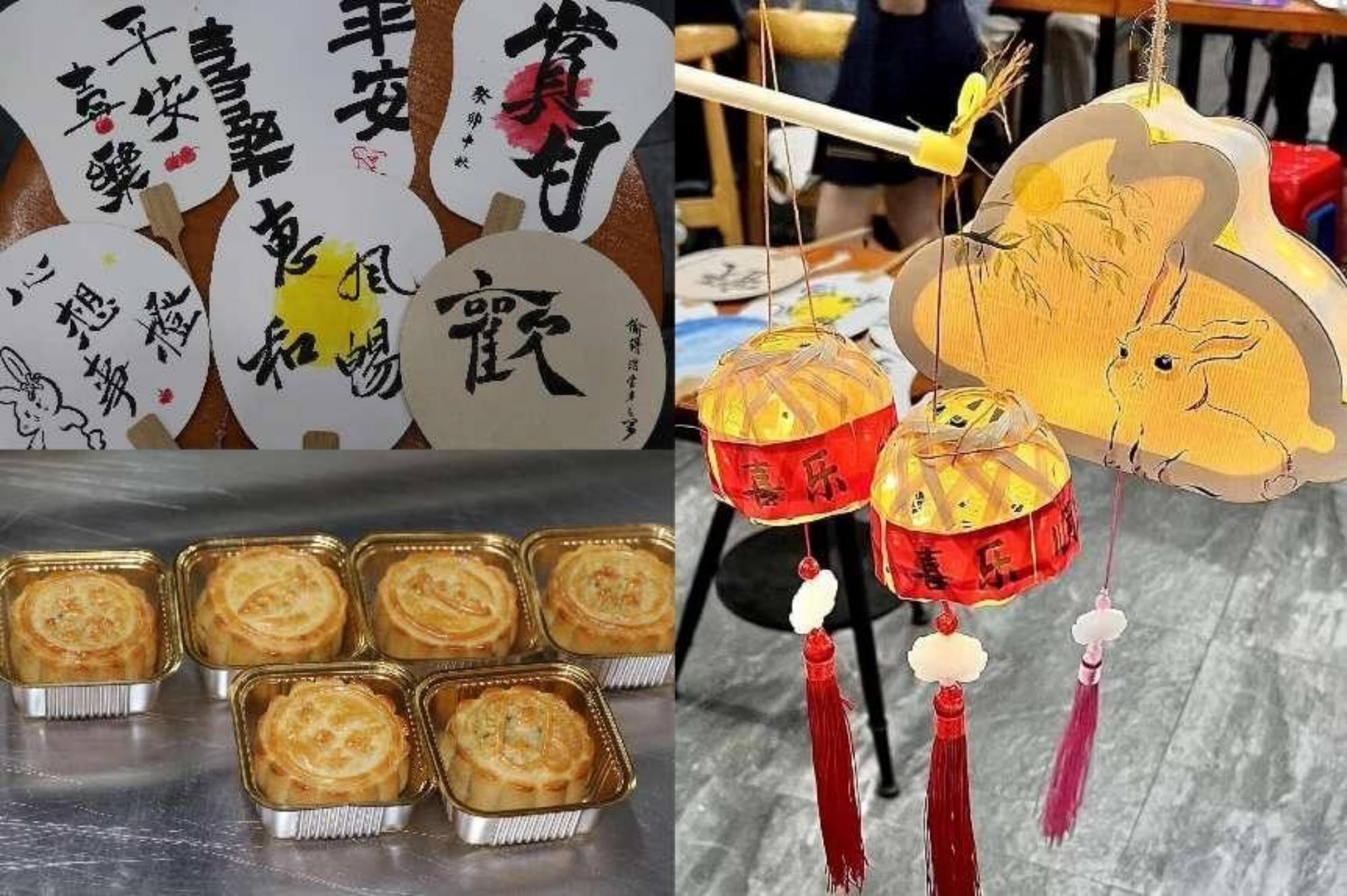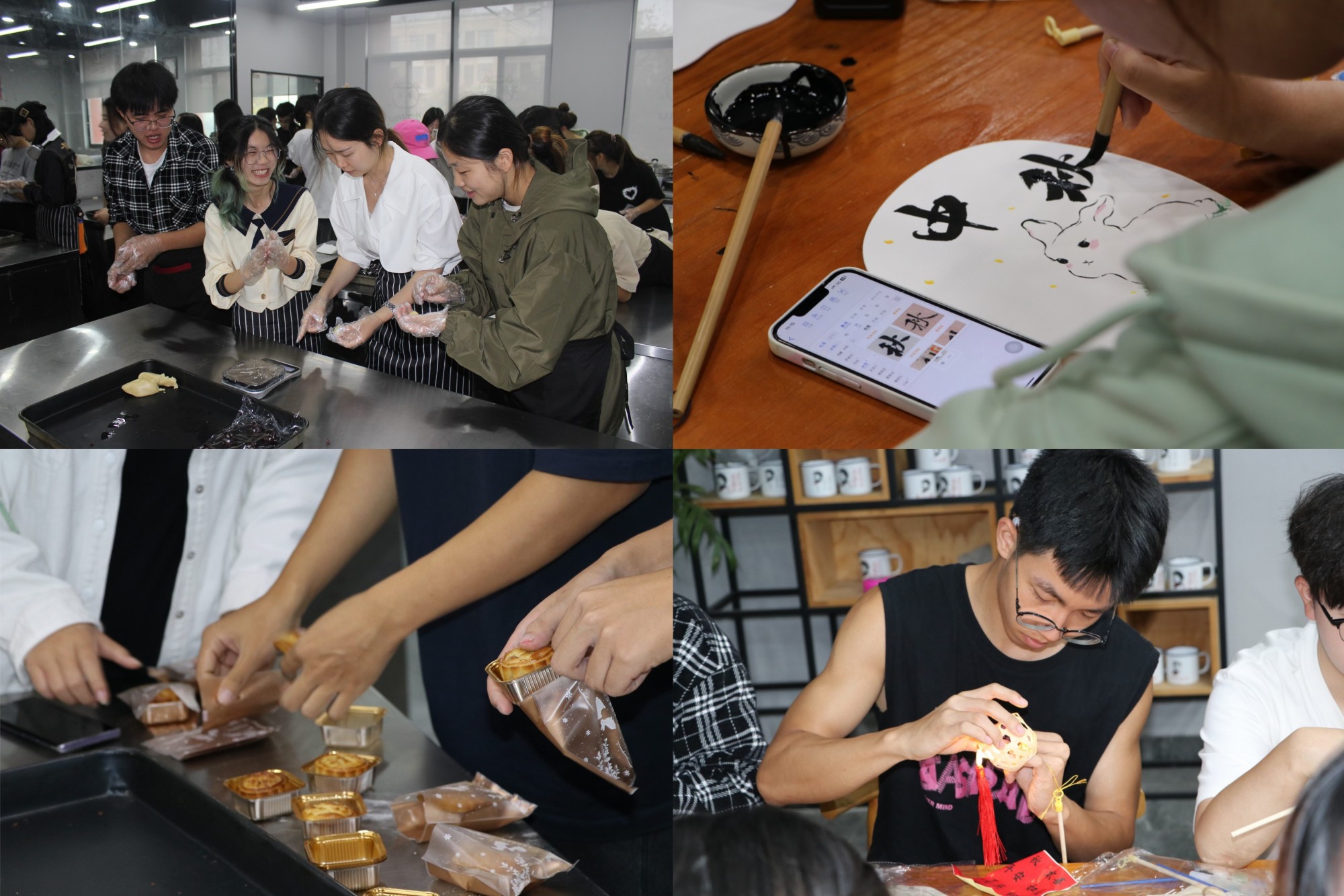 食科院同学做了关于中秋习俗的演讲,展示了制作月饼的工具,讲解了制作月饼的具体流程,美院同学在食科院老师同学的指导下亲手完成了月饼的制作。月饼烤制期间,美院同学发挥自身特长,带领食科院的同学DIY手工花灯制作、绘制团扇,两校同学们亲自设计并合力完成了中秋团扇,同时也在花灯上写下自己的心愿。