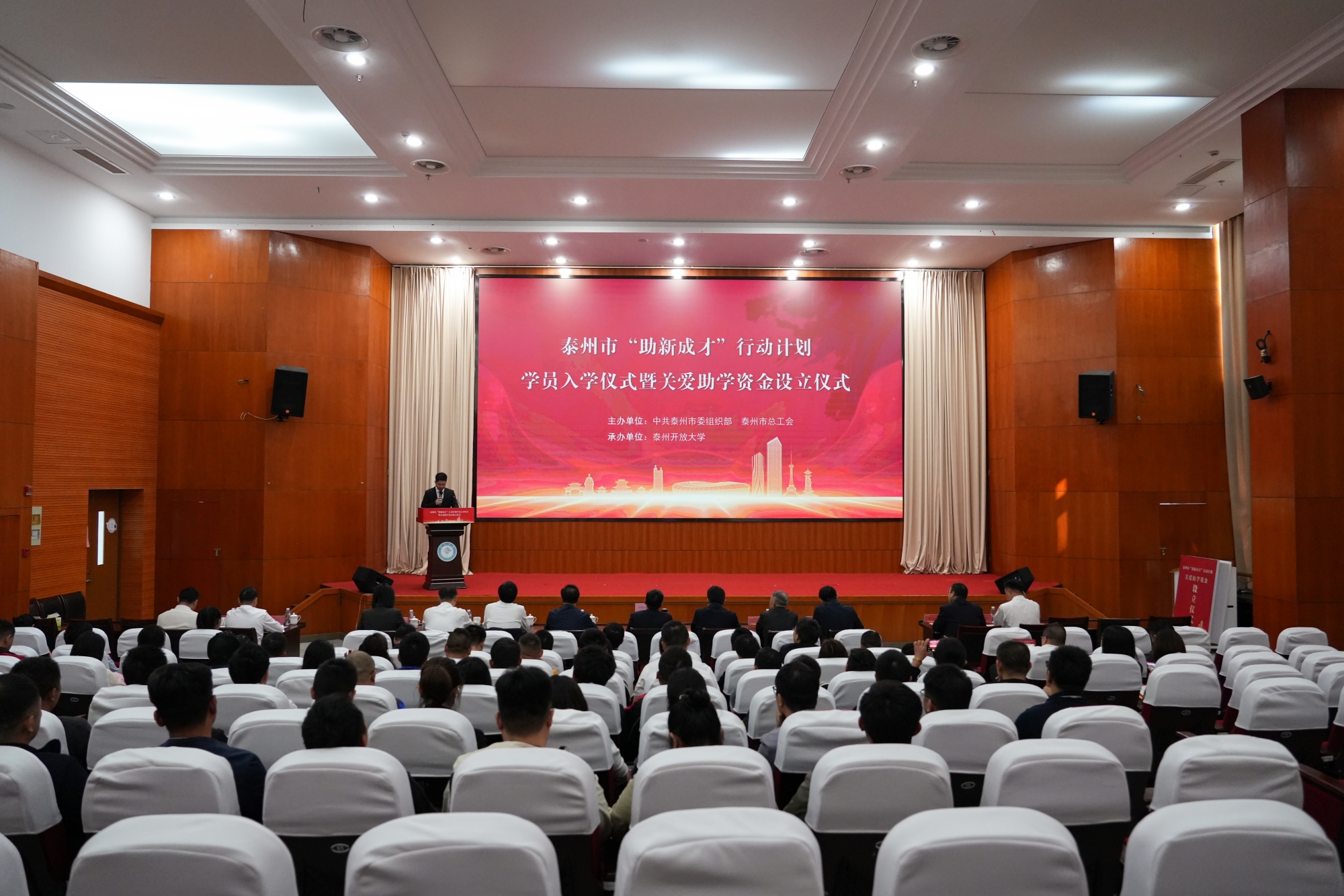 10月15日上午,市委组织部、市总工会联合泰州开放大学在bat365举行泰州市“助新成才”行动计划学员入学仪式暨关爱助学资金设立仪式。校党委副书记、校长季赛,市委组织部副部长、“两新”工委书记、党建办主任赵荣华,校党委常委、副校长徐庆国,江苏开放大学招生工作处处长许浩、省总工会宣传教育和网络工作部四级调研员孟明,市总工会、各行业党委分管负责人出席会议。