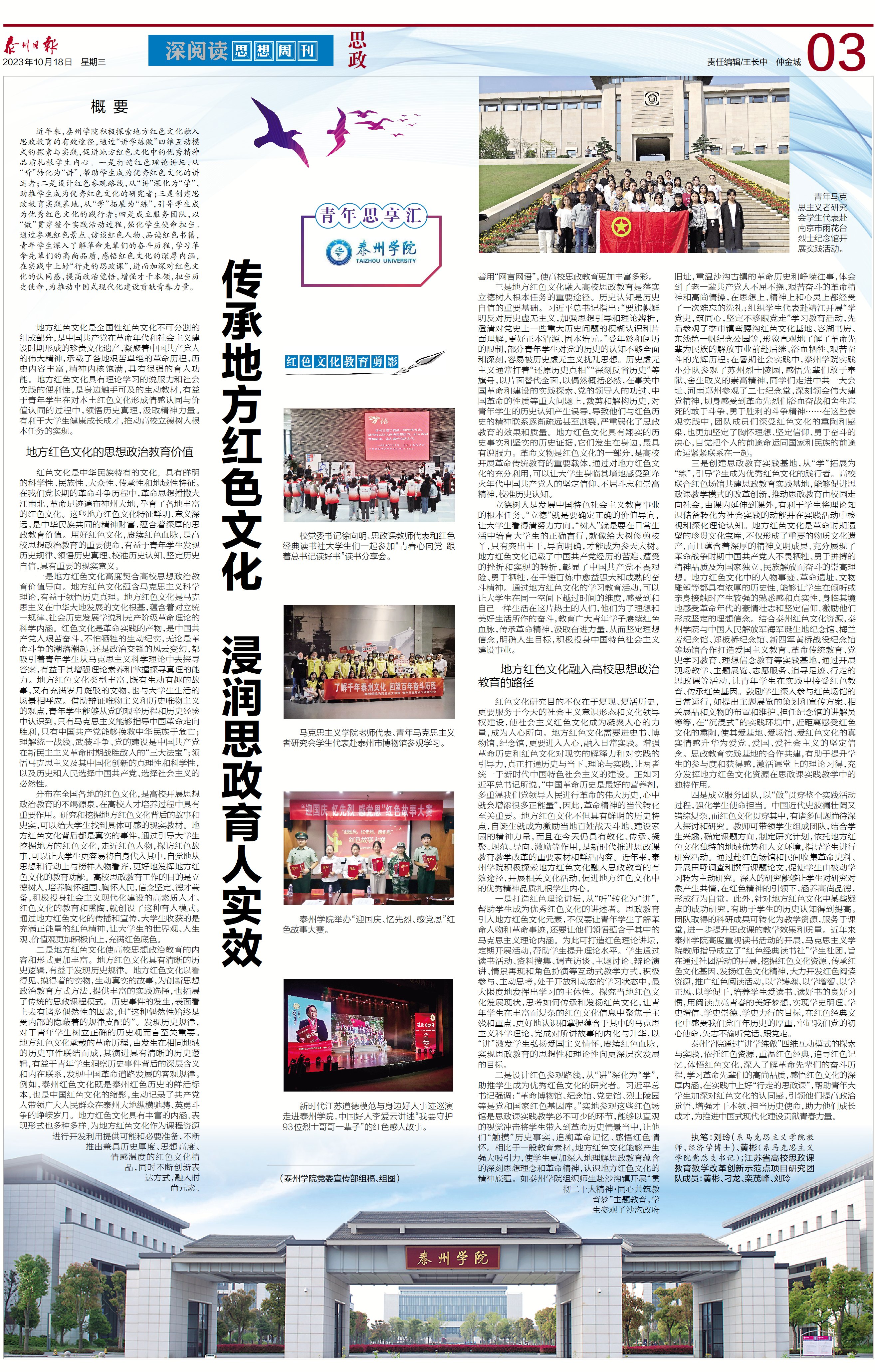 2023年10月18日,《泰州日报》第A03版思政推出《传承地方红色文化 浸润思政育人实效》报道,展现近年来bat365积极探索地方红色文化融入思政教育的研究成果,探索、实践“讲学练做”四维互动模式,促进地方红色文化中的优秀精神品质扎根学生内心。报道链接:http://sz.tznews.cn/tzrb/pc/layout/202310/18/node_A03.html