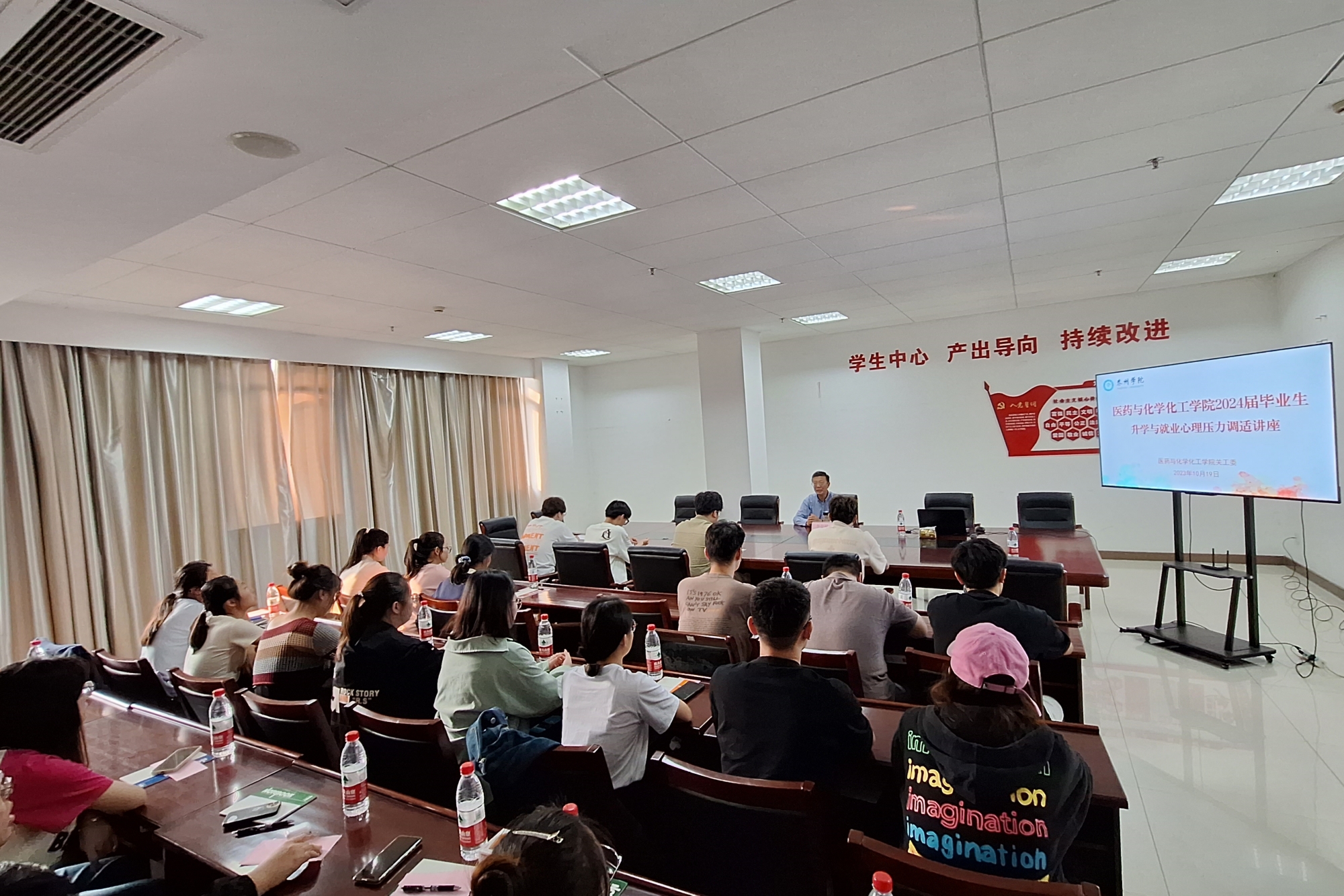 为缓解学生的考研和就业心理焦虑,帮助学生调适心理压力,10月19日下午,医药与化学化工学院关工委在D2201室举办2024届毕业生升学与就业心理压力调适讲座。讲座邀请原医药与化学化工学院副院长李存福副教授主讲,由学院关工委主任张红祥主持,2020级、2021级学生代表和辅导员参加了本次活动。