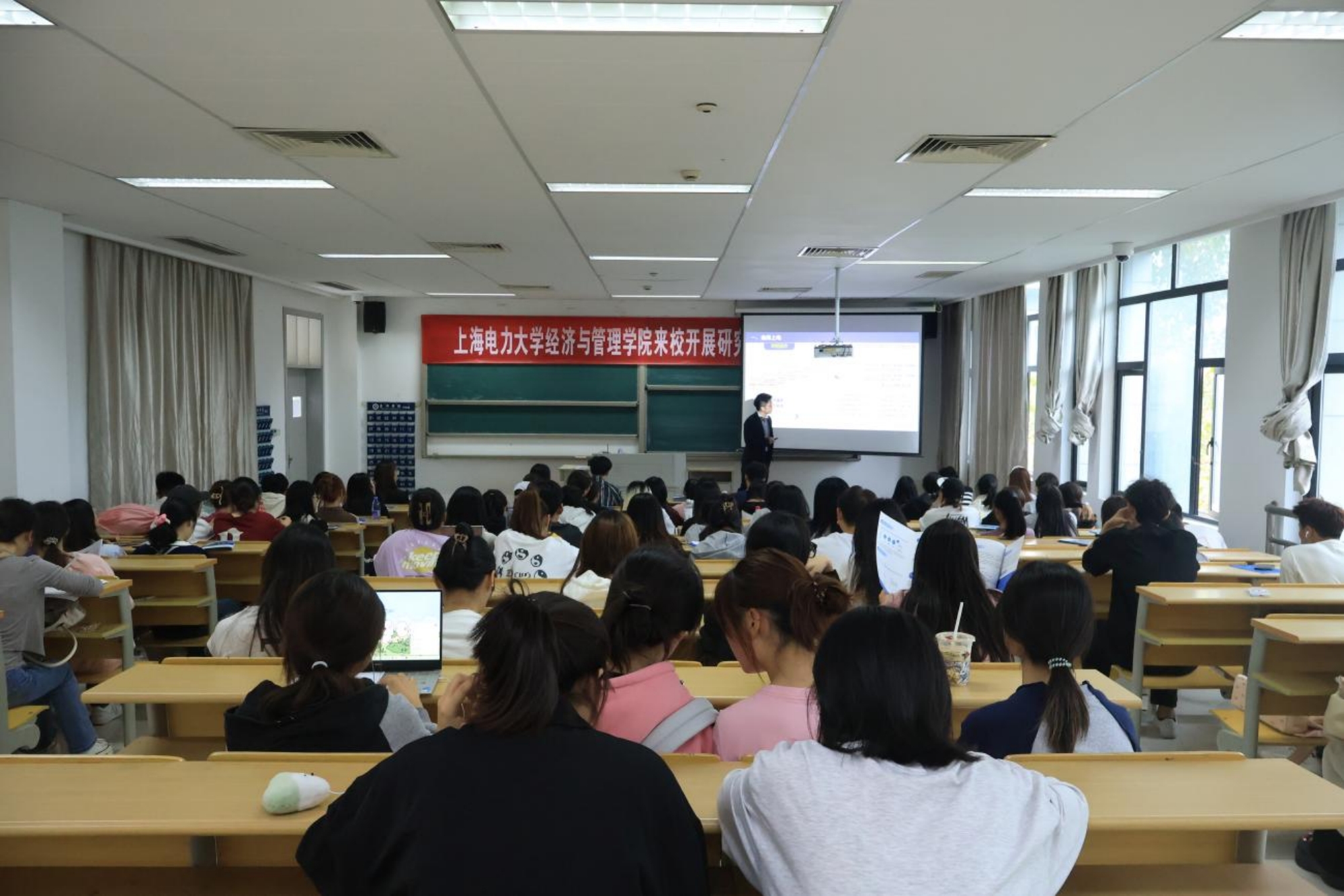 潘仙友向120名大三学生开展研究生招生宣讲,重点围绕上海电力大学经济与管理学院的发展概况、学科建设和未来前景等三方面内容进行解读,并就现场同学关于研究生报考的疑问进行解答。