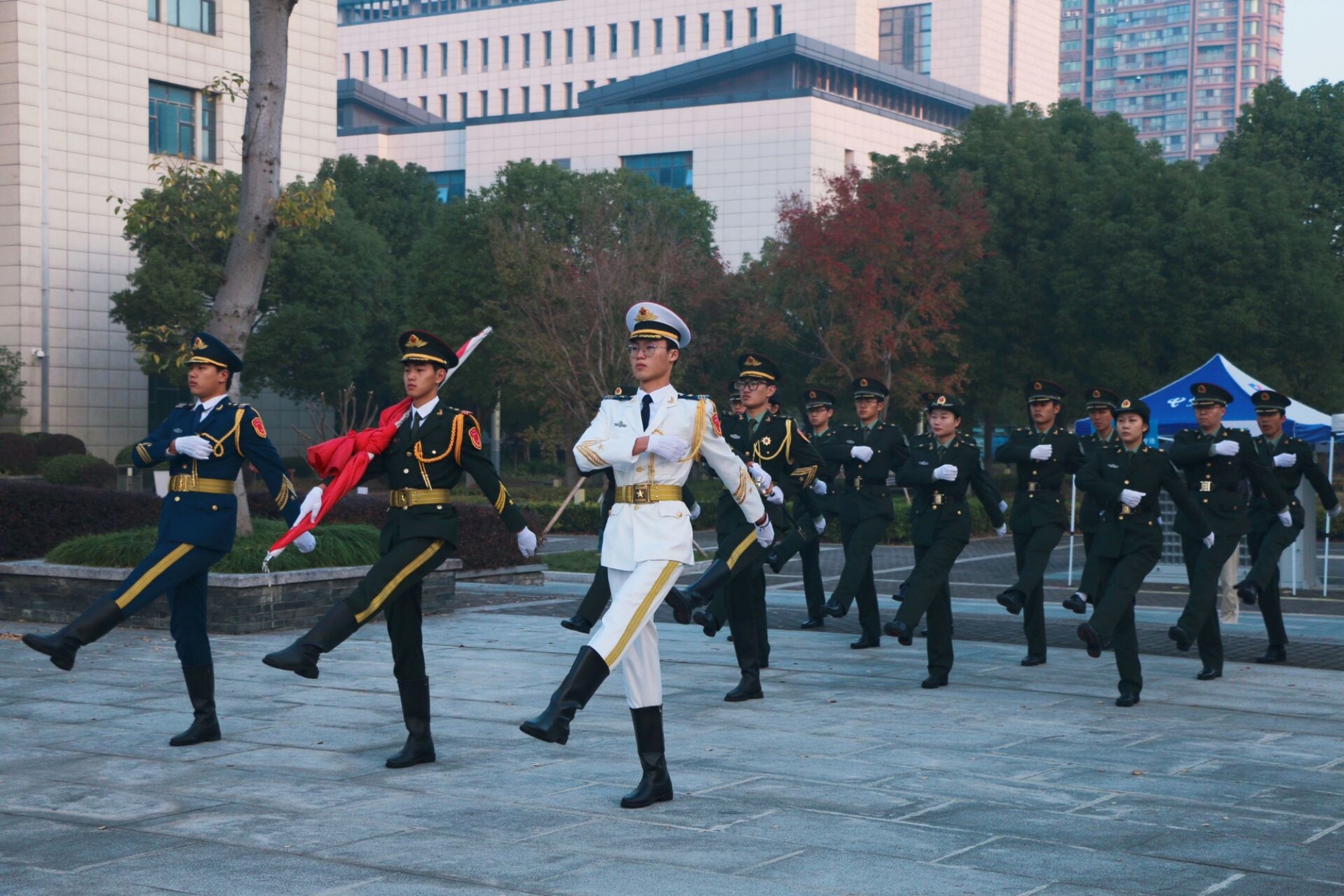 国旗护卫队迈着铿锵有力的步伐护送国旗进场,伴随着国歌的奏响,鲜艳的五星红旗冉冉升起,迎风飘扬。