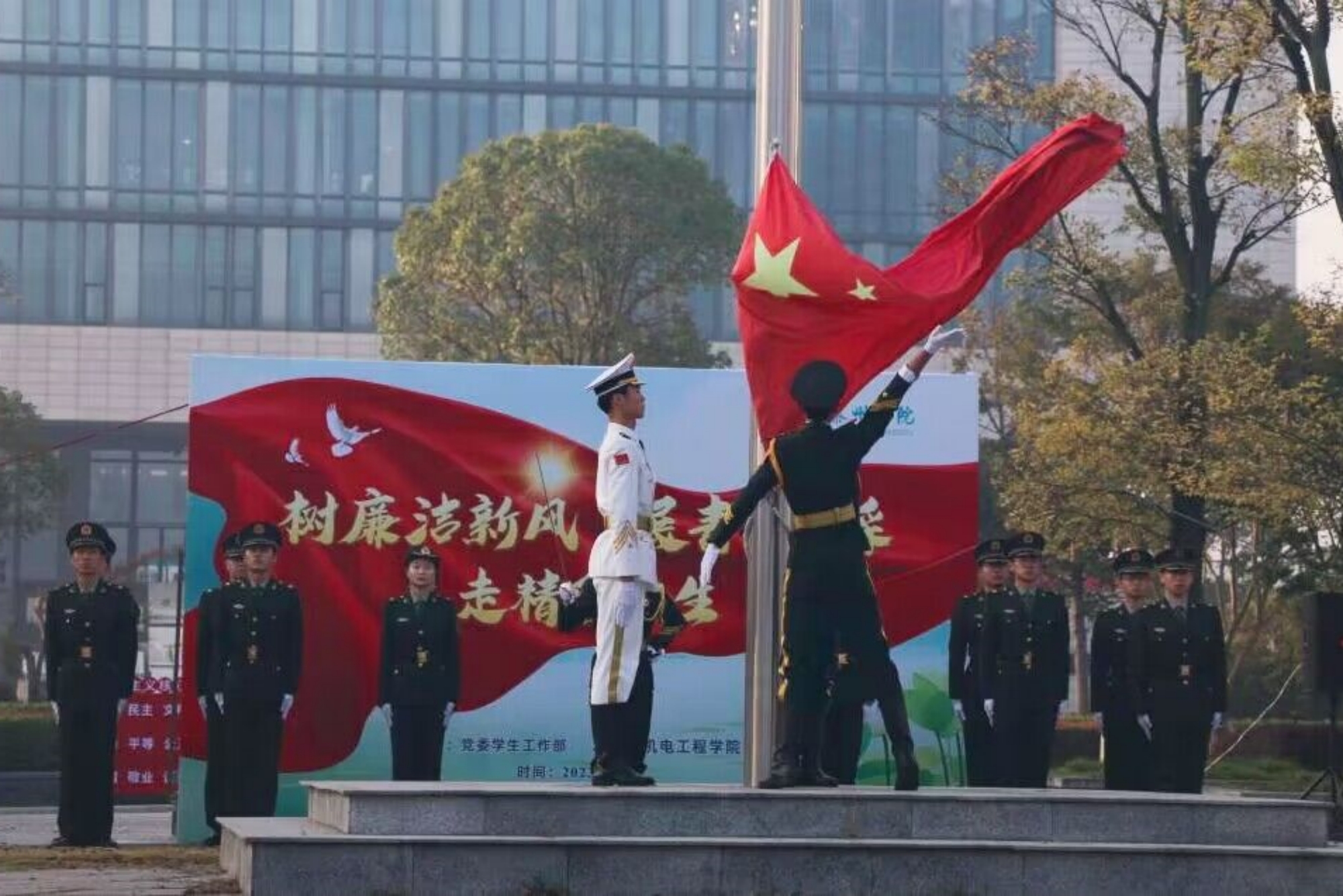 为营造校园崇廉尚洁良好氛围,引导青年学生树立正确的人生观和价值观,10月30日,由党委学生工作部主办、机电工程学院承办的“树廉洁新风,展青年风采,走精彩人生”主题升旗仪式在胡瑗广场举行。学生工作处副处长凡成,机电工程学院院长赵振江,党总支副书记、副院长江峰,全体辅导员和2023级学生参加升旗仪式。