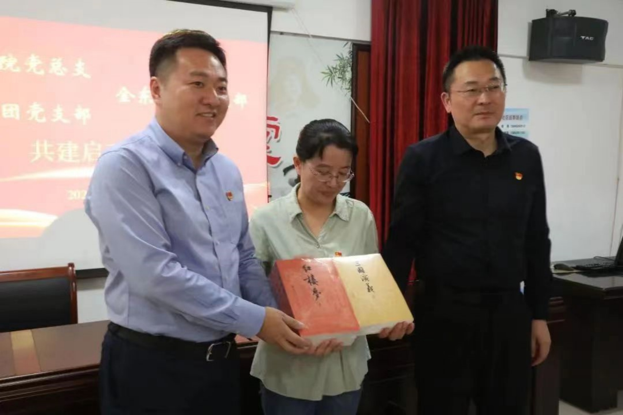 现场,美术学院党总支与东城集团党支部还赠送了书籍给金东社区党总支,美术学院学生党员代表向社区赠送了创作的文化作品。