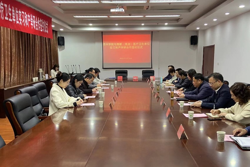 11月14日上午,在泰州医药高新区(高港区)卫健委的安排下,数理学院与泰州医药高新区(高港区)医疗卫生系统的四家单位在区卫健委6楼会议室举行了实习和产学研合作签约仪式。医药高新区(高港区)人民政府副区长孙达妮,区卫健委党组书记蒋加华,数理学院副院长王成敏、王志华等领导参加仪式,仪式由蒋加华主持。