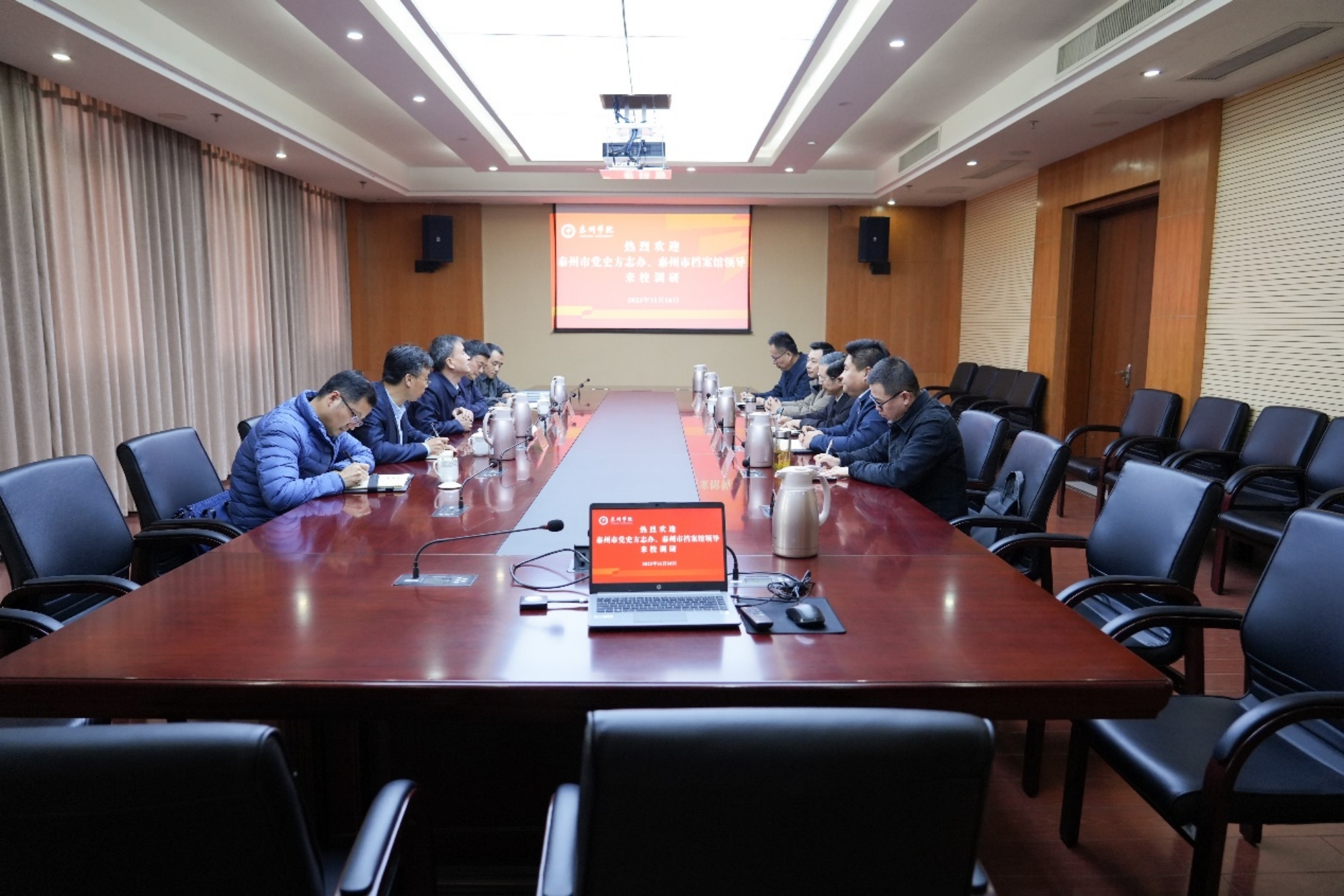 11月16日,市党史方志办走访bat365,就进一步发挥各自优势,协同做好党史研究、育人、资政等工作进行座谈交流。市党史方志办主任张士林、副主任申万霞、资源开发处处长于勇,校党委副书记邓友祥、办公室主任蒋凤锁、马克思主义学院班子成员等参加座谈交流。