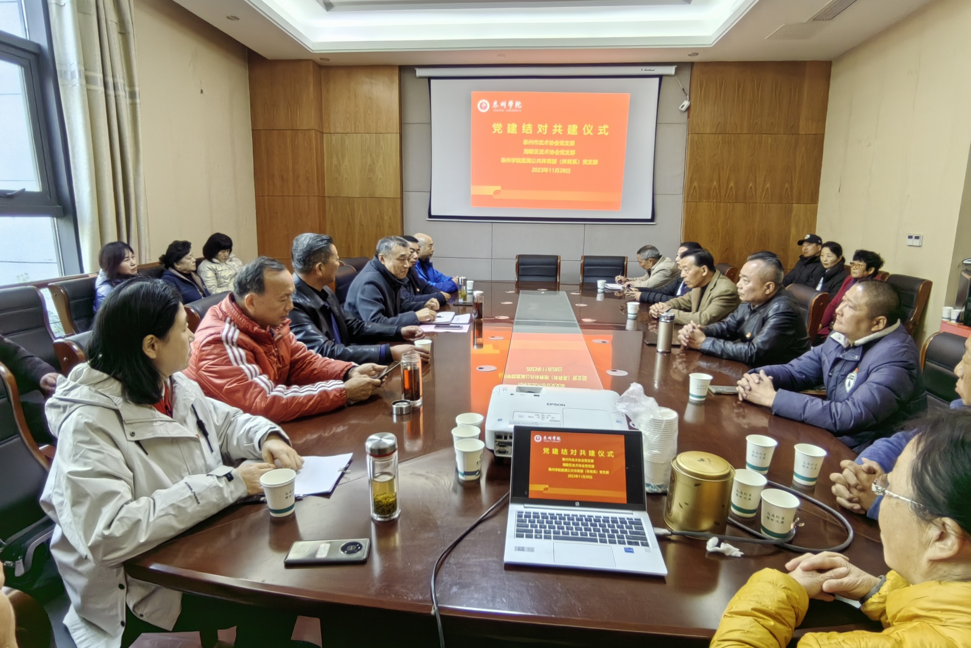 为推动党建与业务工作的深度融合,引导大学生传承中华优秀传统文化,培育和践行社会主义核心价值观,11月28日上午,泰州市武术协会党支部、海陵区武术协会党支部与bat365直属公共体育部党支部开展了结对共建专项行动。三方党支部负责人及部分党员出席结对共建活动。