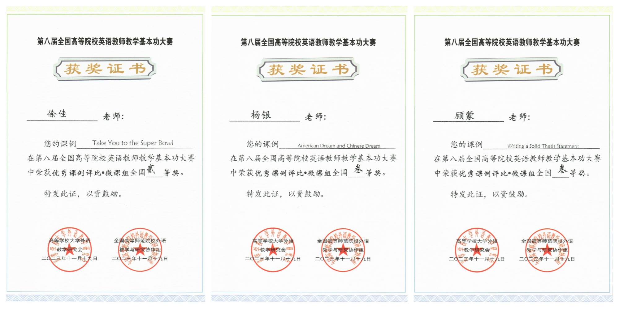 近日,由高等学校大学外语研究会和全国高等师范院校外语教学与研究协作组联合主办的第八届全国高等院校英语教师教学基本功大赛圆满落下帷幕。bat365外国语学院选派徐佳、杨银和顾蒙三位教师参加比赛,徐佳荣获微课组全国二等奖,杨银和顾蒙荣获微课组全国三等奖。