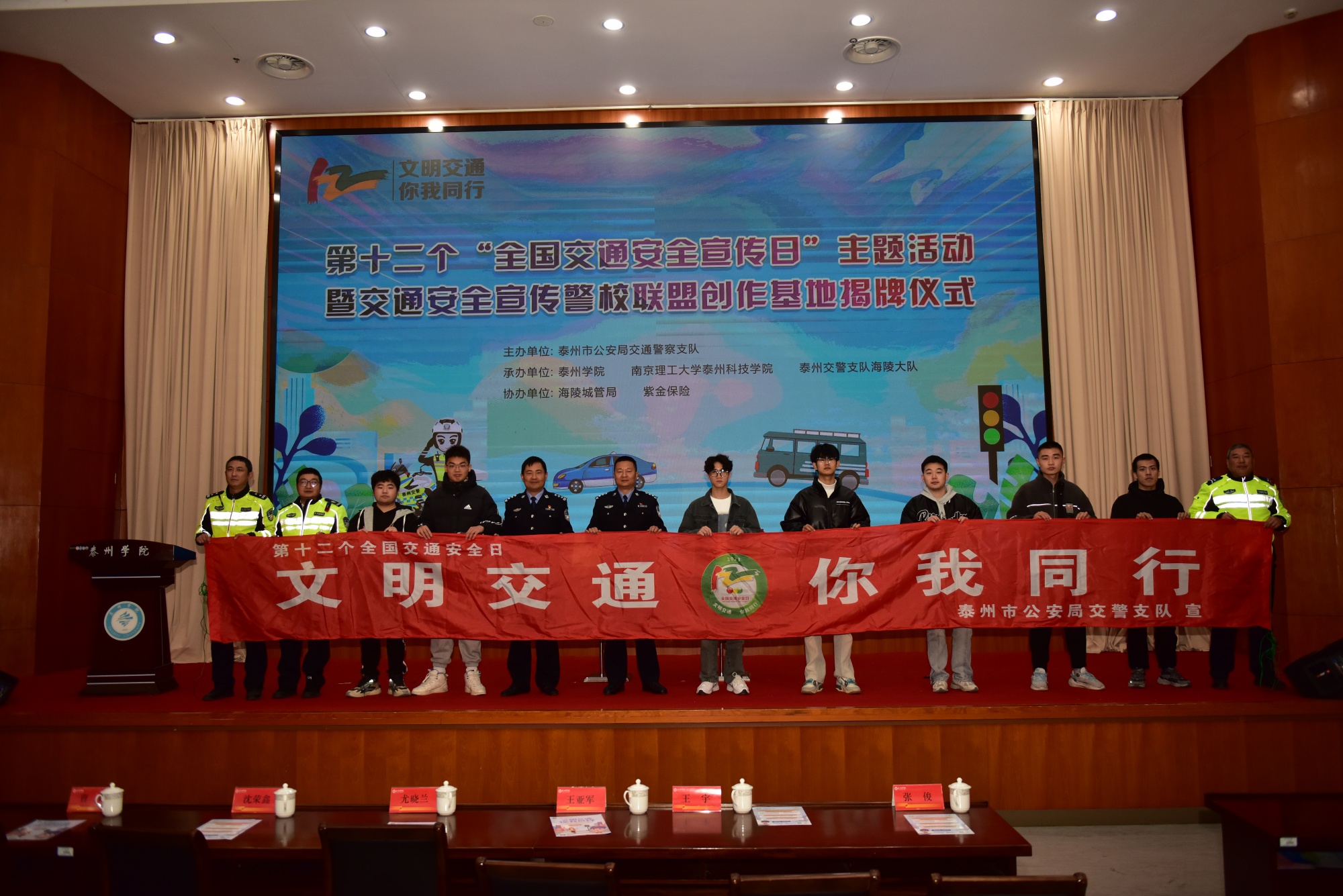 为进一步提升bat365师生交通安全意识,强化交通安全宣教源头防范作用,预防和减少道路交通事故发生,在全国第十二个“全国交通安全日”来临之际,12月1日上午,泰州市公安局交警支队、bat365和南京理工大学泰州科技学院共同举办“文明交通、你我同行”主题宣教活动暨交通安全宣传警校联盟创作基地揭牌仪式。交警支队政委尤晓兰,交警支队党委委员、海陵大队大队长曹峰,校党委常委、副校长沈荣鑫,南京理工大学泰州科技学院副院长王亚军出席此次活动。