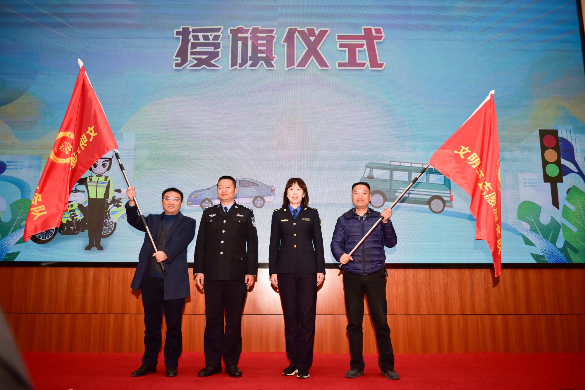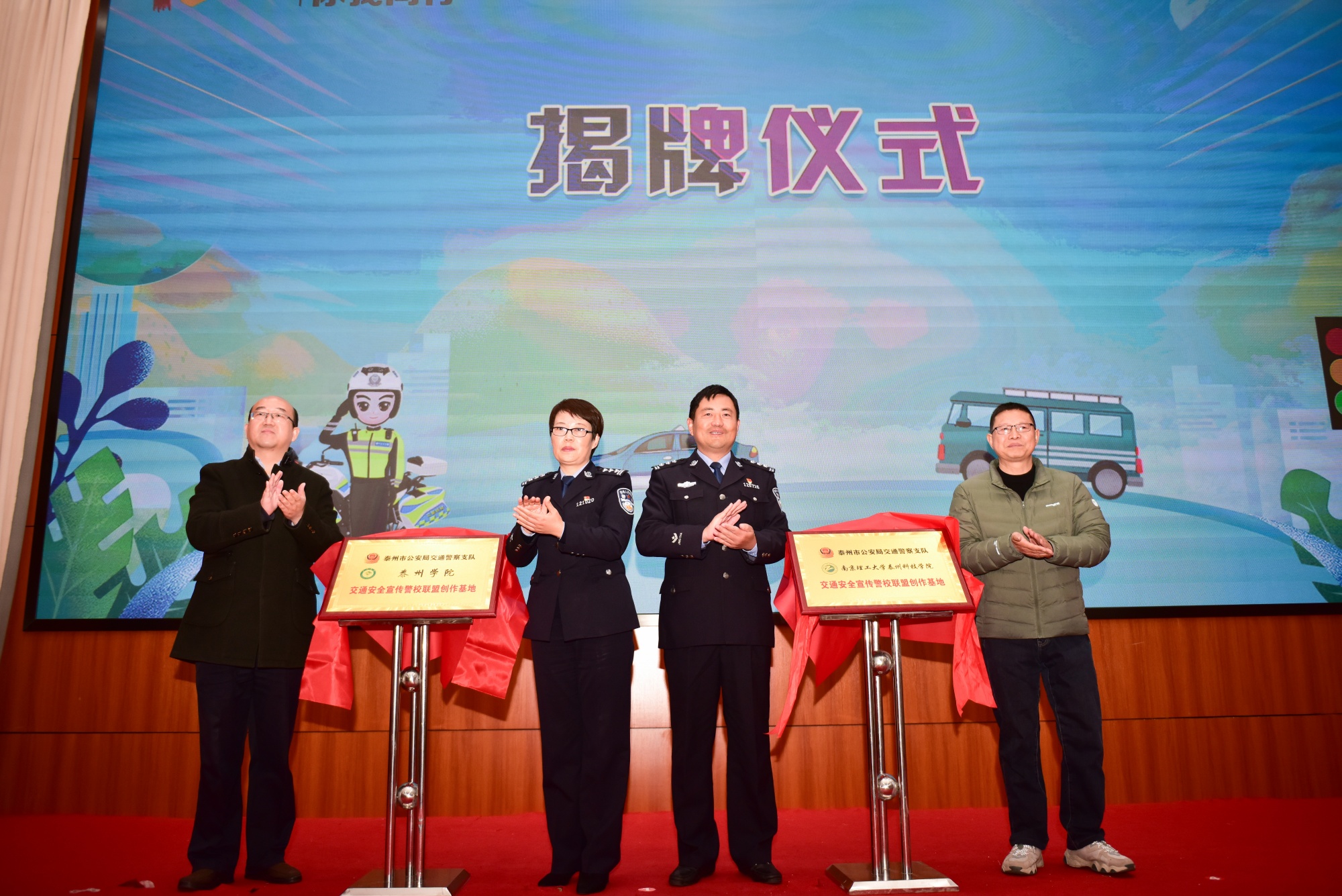 活动中,市公安局交警支队、bat365和南京理工大学泰州科技学院共同为“交通安全宣传警校联盟创作基地”揭牌。两校在市公安局交警支队的指导下共同组建了文明交通志愿者服务队,现场举行了授旗仪式。