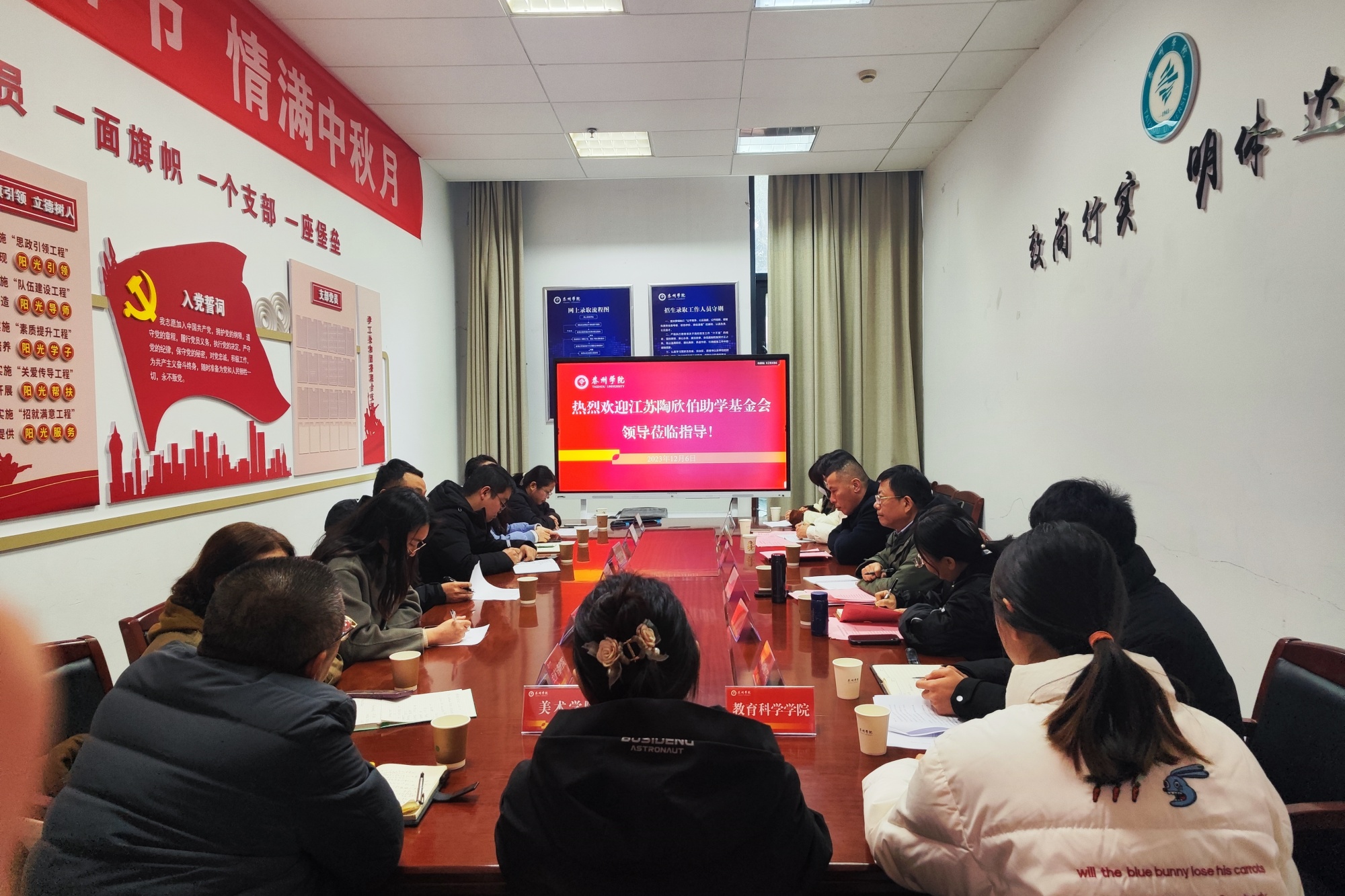 12月6日,bat365举行2023级陶学子入社仪式暨伯藜助学金管理工作座谈会。江苏陶欣伯助学基金会秘书长张利伟、项目经理二部主管李立,学校学生工作处相关负责人出席活动,并为新一届陶学子佩戴社徽。