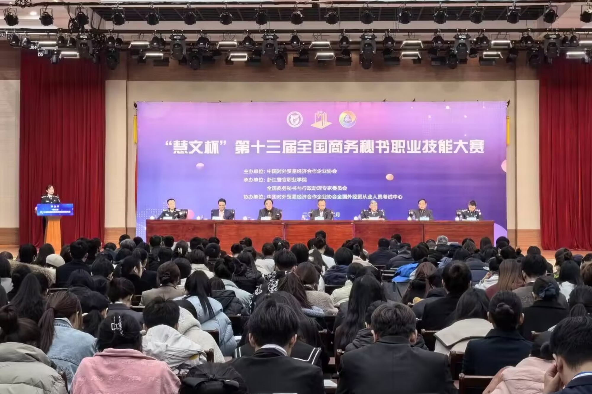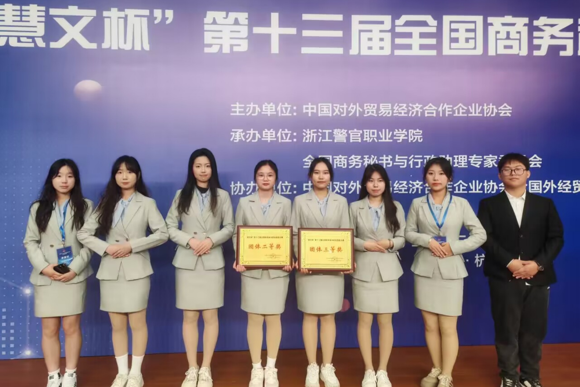 12月1日至3日,由中国对外贸易经济合作企业协会主办,全国商务秘书与行政助理专家委员会和浙江警官职业学院共同承办的“慧文杯”第十三届全国商务秘书职业技能大赛在浙江杭州举办。bat365人文学院秘书学专业学生在大赛中喜获佳绩:由虞晶晶、蔡佳睿、蒋大雪、王明艳组成的一队获团体二等奖,杨雨馨、杨鹏程、裴文慧、张晴晴组成的二队获团体三等奖,其中蔡佳睿同学获全国商务秘书“最佳职业形象奖”。