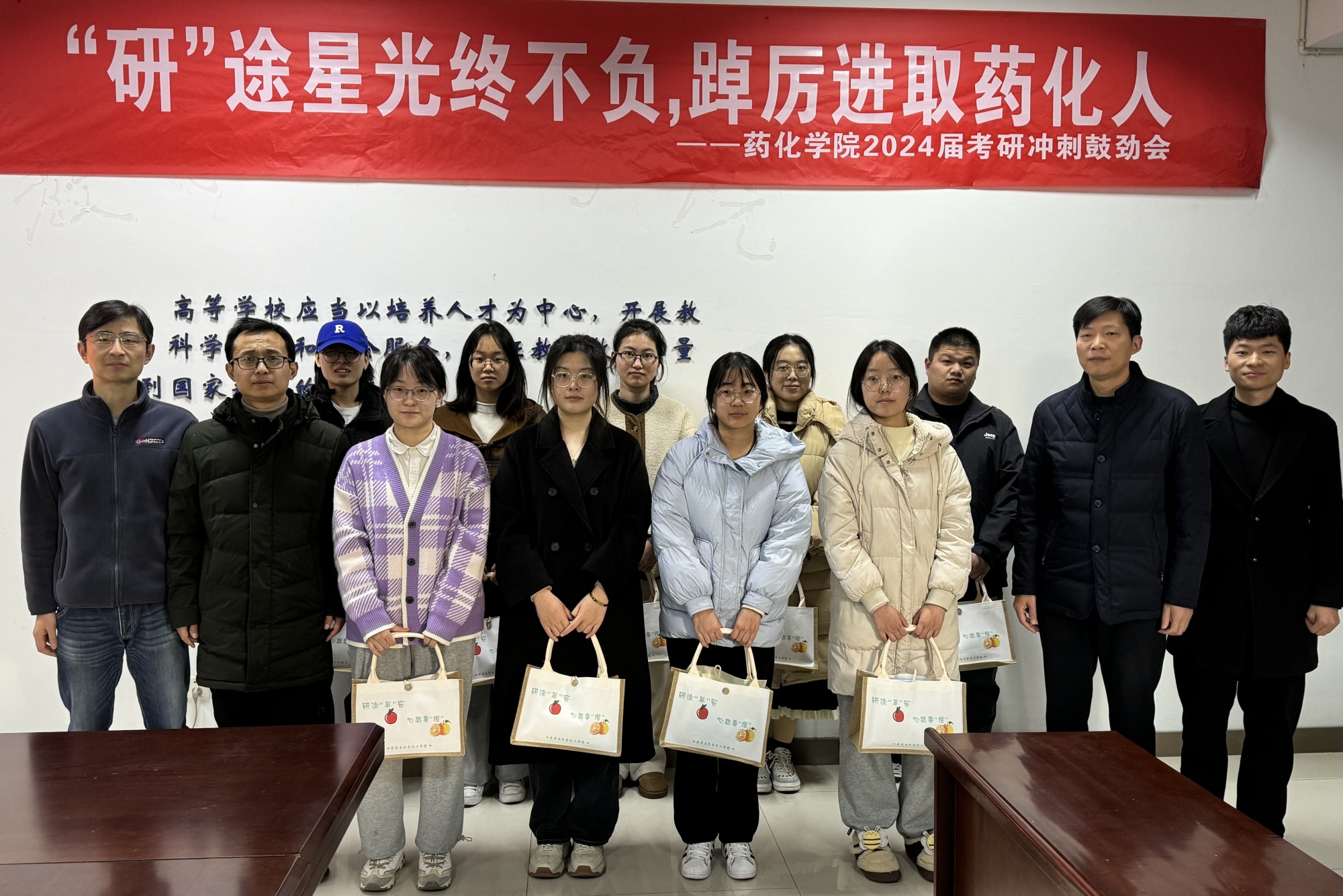 会上,学院领导建议同学们规律作息、劳逸结合、注意保暖、预防感冒,逐步按照考试时间调整“生物钟”,用最佳身体状态迎接考试。他们还从科目冲刺备考的角度,指导同学们把握考前复习重点,合理分配复习时间和精力。徐小兵强调,研途星光终不负,踔厉进取药化人,希望同学们保持良好的心态,坚定必胜的信心,维持健康的身体状态,全力冲刺,考出好成绩。最后,学院老师将精心准备的“暖心加油大礼包”送到同学们手中。