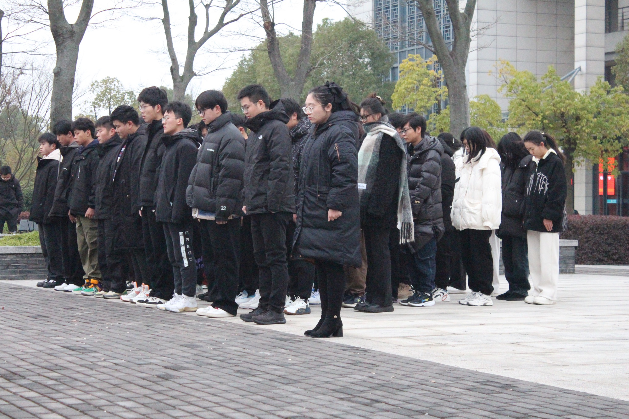 升旗结束后,全场师生为南京大屠杀死难同胞默哀。