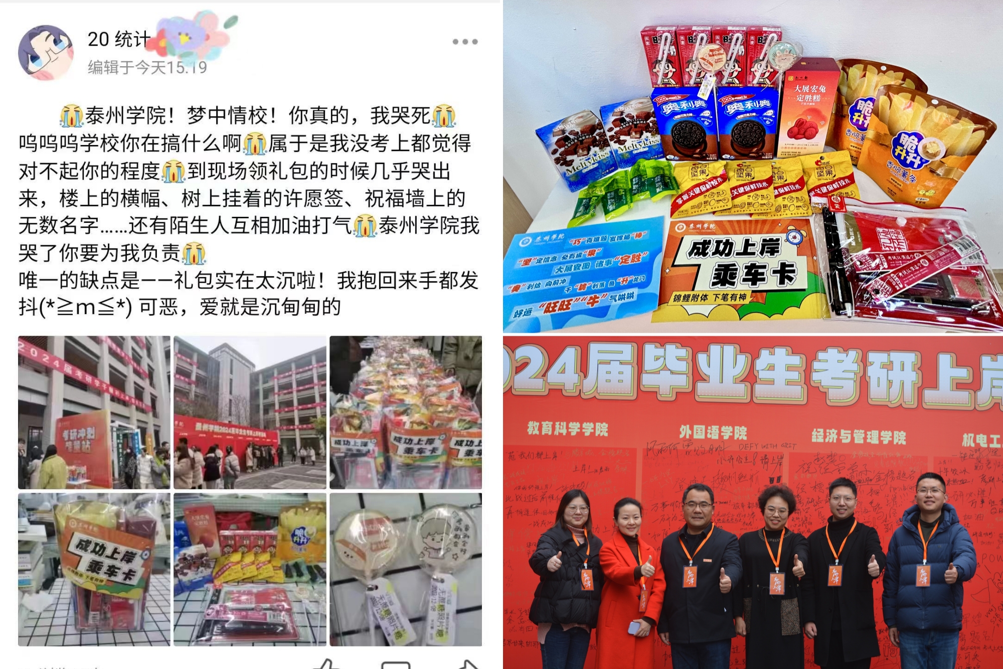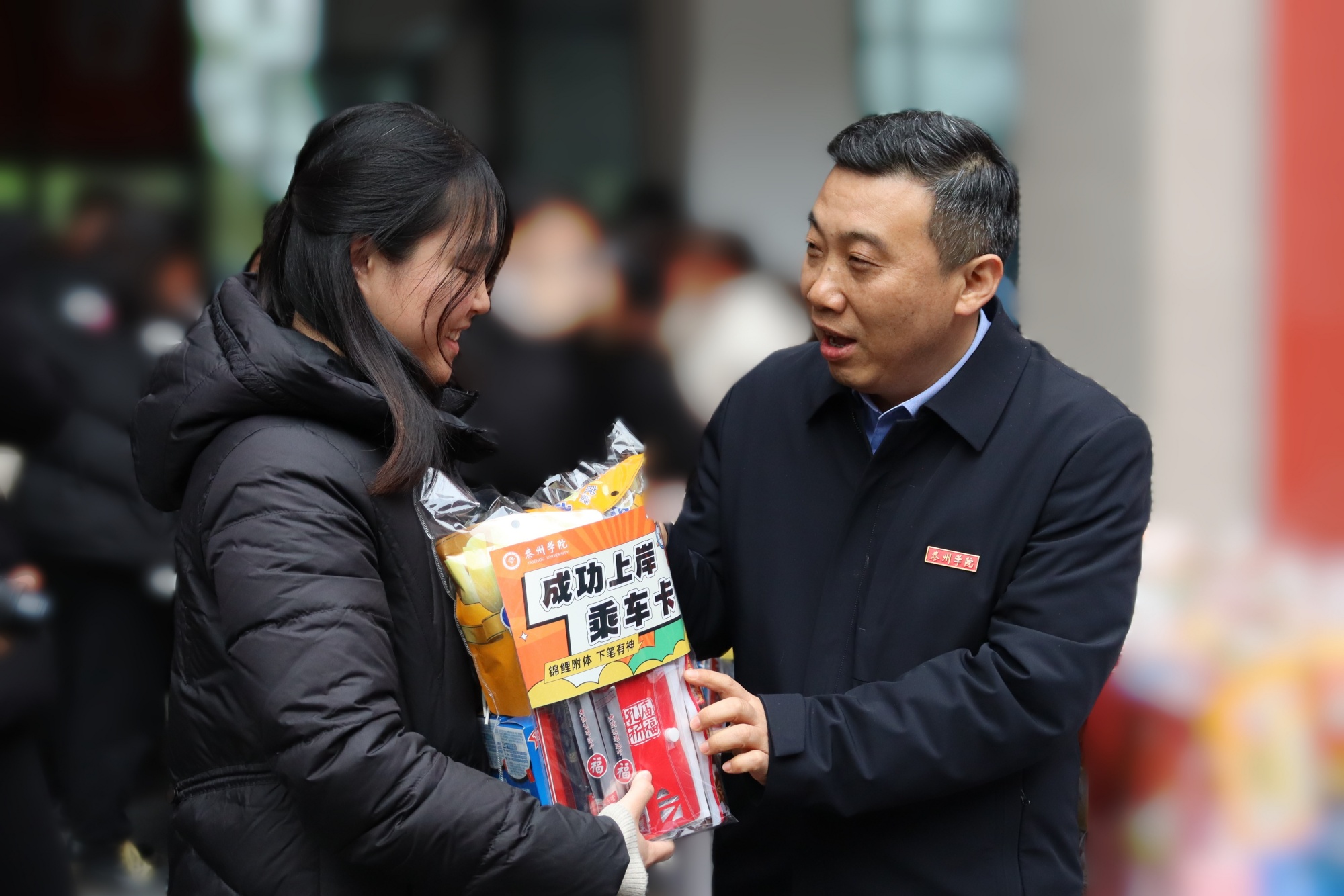 活动现场,徐向明和季赛给考研同学发放“能量礼包”。礼包里有祈福文具袋、送考乘车卡、“定胜”糕团、旺仔牛奶等含有吉祥寓意的物品。他们将“能量大礼包”和学校的美好祝愿送给学生,预祝他们诸事“定胜”,成功上岸。