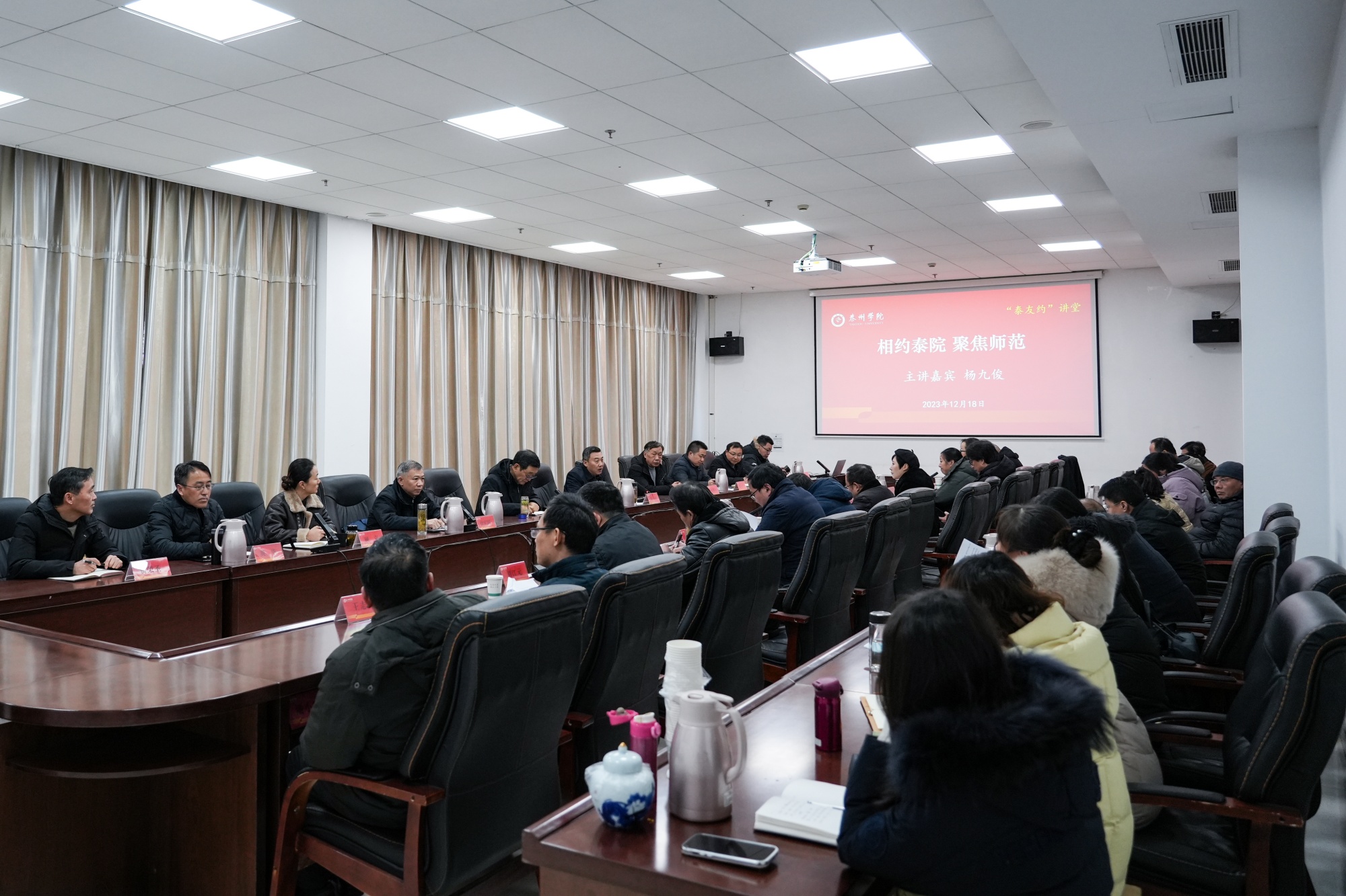 12月18日下午,“泰友约”讲堂第一期正式开讲。bat365杰出校友、国内基础教育著名专家杨九俊研究员应邀担任首讲嘉宾,党委副书记、校长季赛主持,党委常委、副校长徐庆国,校友联谊会常务副会长张曙光出席,校友办、教务处、学工处、科研处、教育教学评估中心、师范教育中心、开设师范专业的二级学院的相关同志参加本次活动。