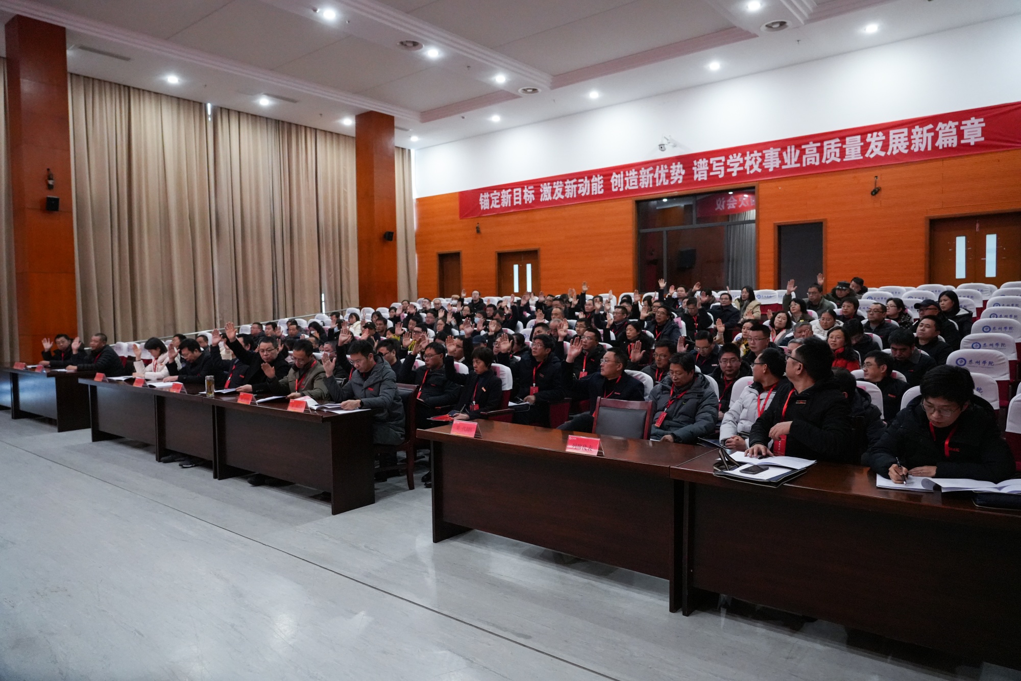 徐向明在讲话中指出,本次会议是学校划转为省属高校后的首次“两代会”,是一次团结民主、务实奋进、凝聚力量的大会。为了更好地在学校事业高质量发展的新征程上攻坚克难、争先进位,徐向明提出四个“必须”:一是必须旗帜鲜明讲政治,持续强化政治理论武装,全面落实立德树人根本任务,贯彻落实党的决策部署,始终在思想上、政治上、行动上同以习近平同志为核心的党中央保持高度一致;二是必须保持赶考心态,进一步解放思想、深化改革、练好内功,努力争先进位;三是必须全力以赴抓落实,要以闯的精神、创的劲头、干的作风,争先进位、脚踏实地、团结奋进;四是必须树牢宗旨意识,在促成长、助成才,办实事、解难事,讲民主、优机制上下功夫,以接地气、暖人心的工作举措赢得师生的信赖。徐向明号召,全校上下更加紧密地团结在以习近平同志为核心的党中央周围,坚定不移以习近平新时代中国特色社会主义思想为指导,锚定目标争先进位,攻坚克难担当作为,齐心协力推进学校事业更高质量发展!