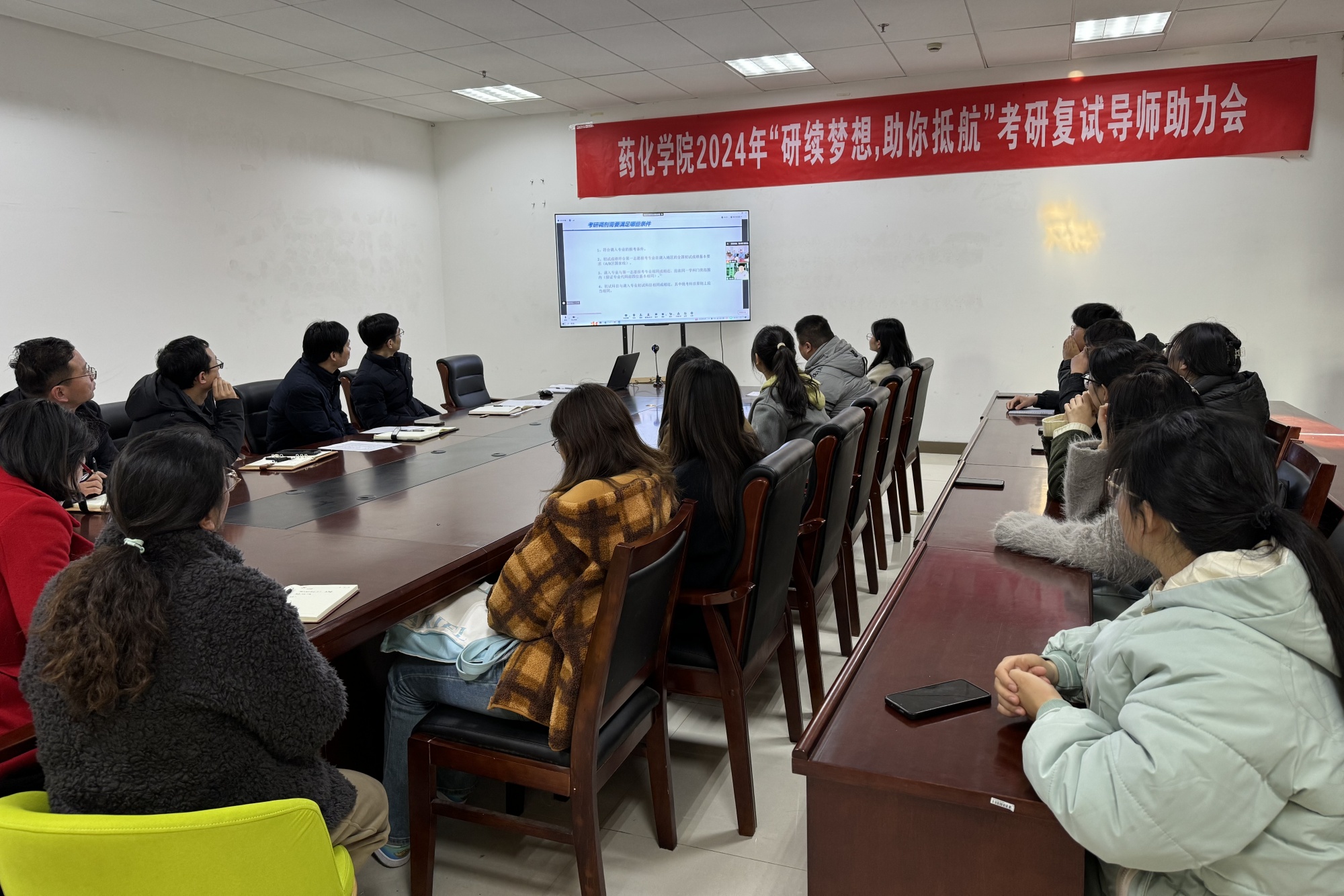 为扎实做好2024届考研学生的复试调剂指导和服务工作,提高学生考研复试成功率,3月8日下午,医药与化学化工学院以“研续梦想,助你抵航”为主题,在行政楼D2201会议室召开考研复试导师助力会。学院领导班子成员、助研导师代表、毕业班班主任、辅导员以及考研初试过线学生参加了本次活动。