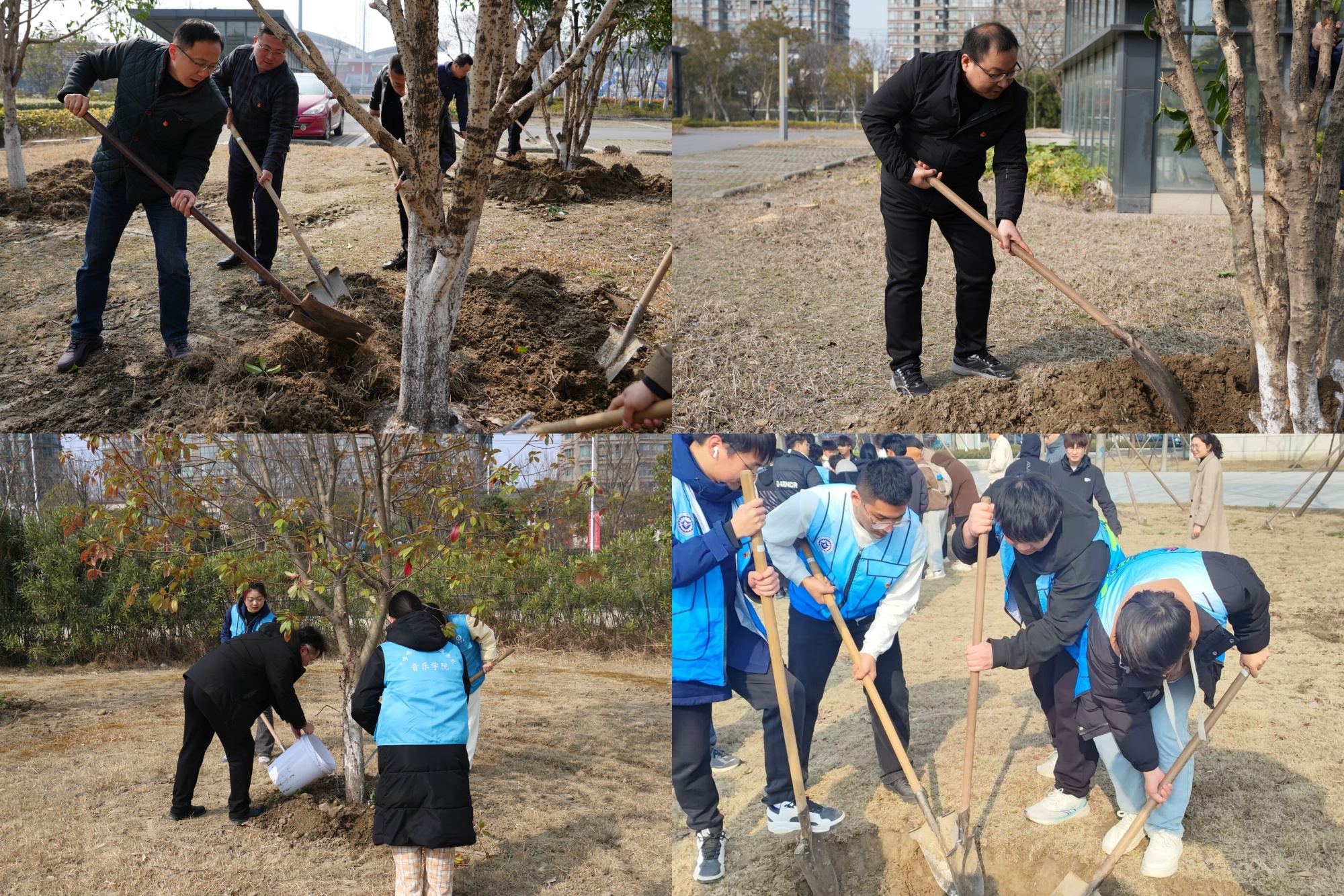 在第46个植树节到来之际,3月12日下午,后勤机关党支部、师范教育中心党支部、机电工程学院学工党支部和音乐学院学工党支部联合开展“‘植’此青绿,共‘树’未来”主题党日活动。