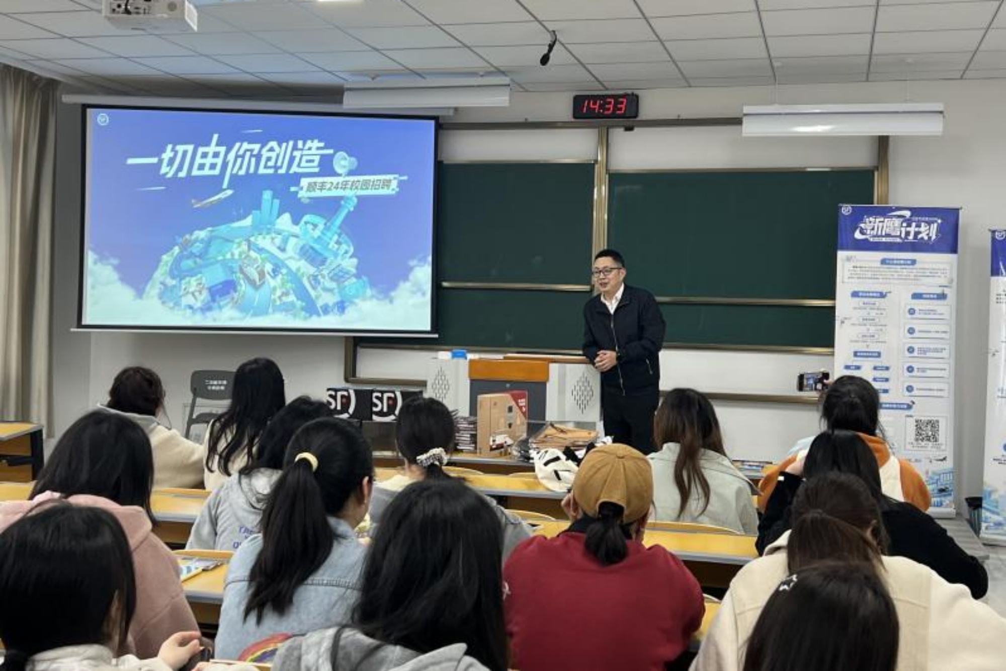 招聘宣讲会在G4401举办,罗几章向100名大四学生开展招聘宣讲,重点围绕南通顺丰的发展概况、集团框架和未来前景等方面内容进行解读,并就入职后实习薪资和行业发展等学生重点关注问题进行答疑。