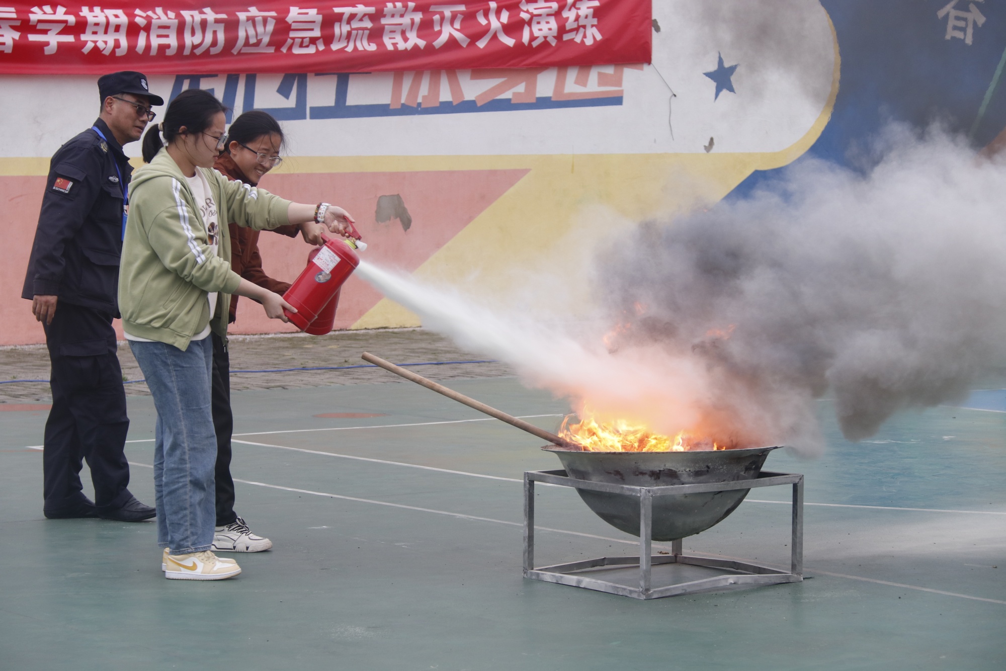 下午三点,卜慧芬宣布演练开始。随着警报声的响起,参演学生按照规定的疏散路线快速、安全、有序地从宿舍区疏散至篮球场,完成了应急疏散演练。演练完成后,陈根怀对演练情况进行点评,为同学们讲解了火灾的逃生技巧和常用灭火设施的使用方法,学生代表进行了油盆灭火实战演练。