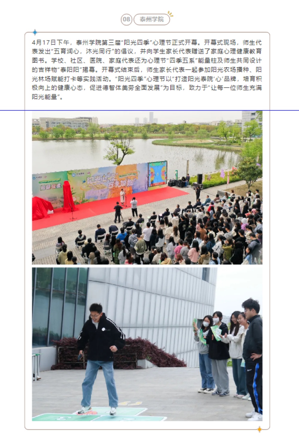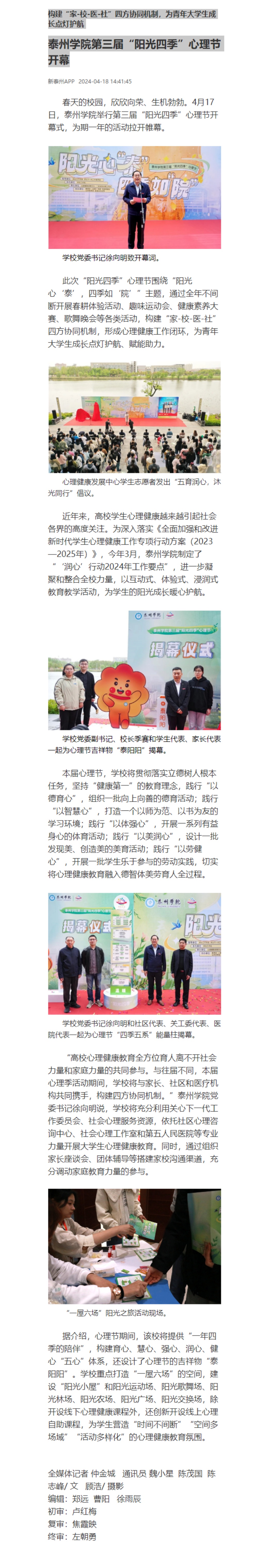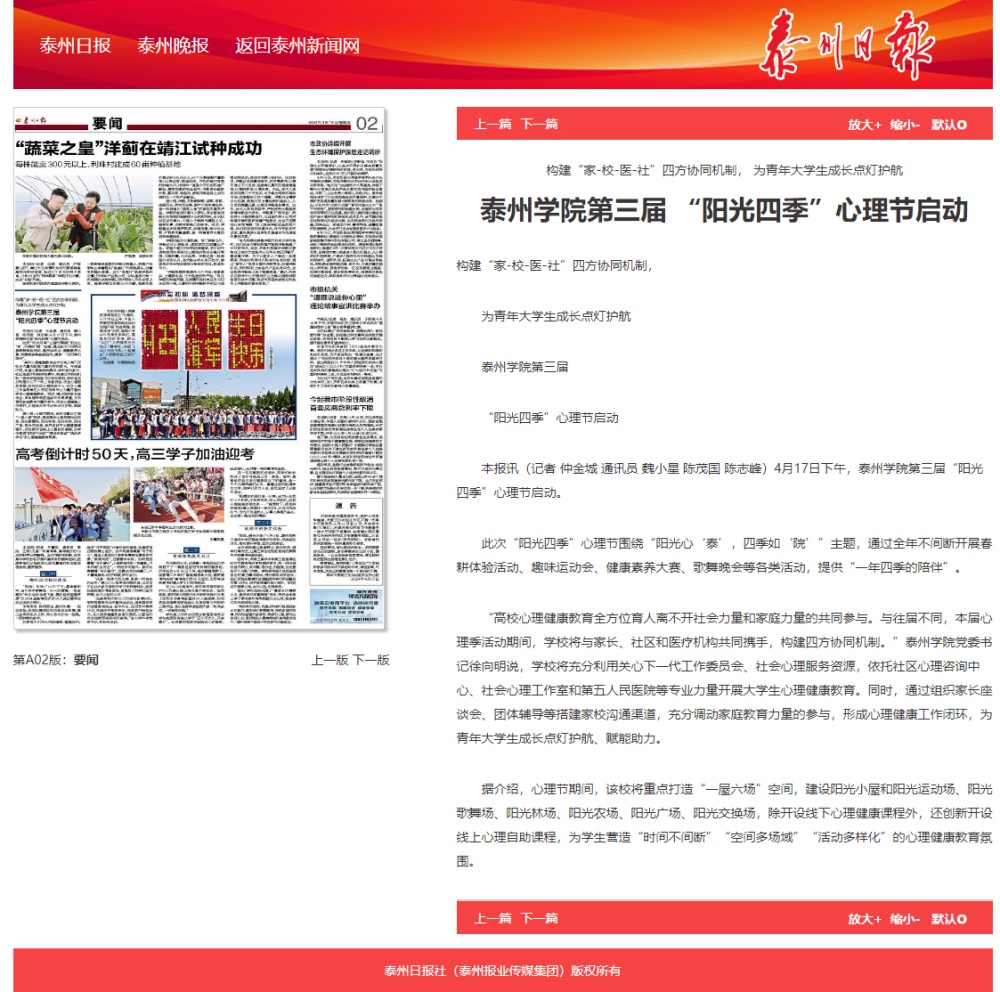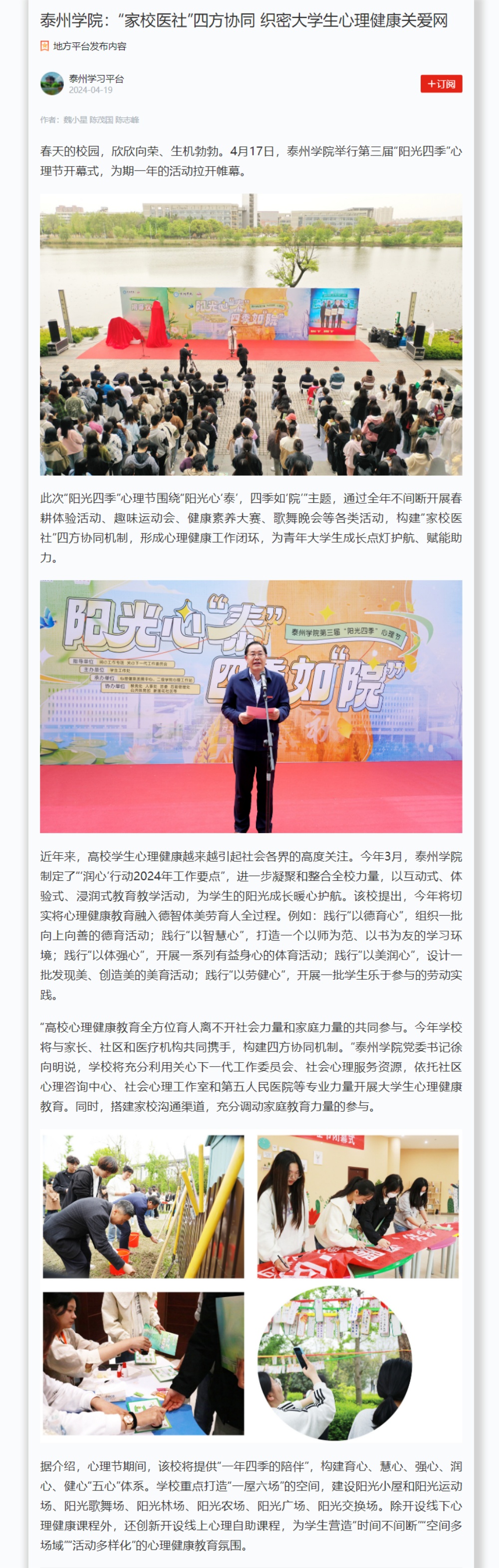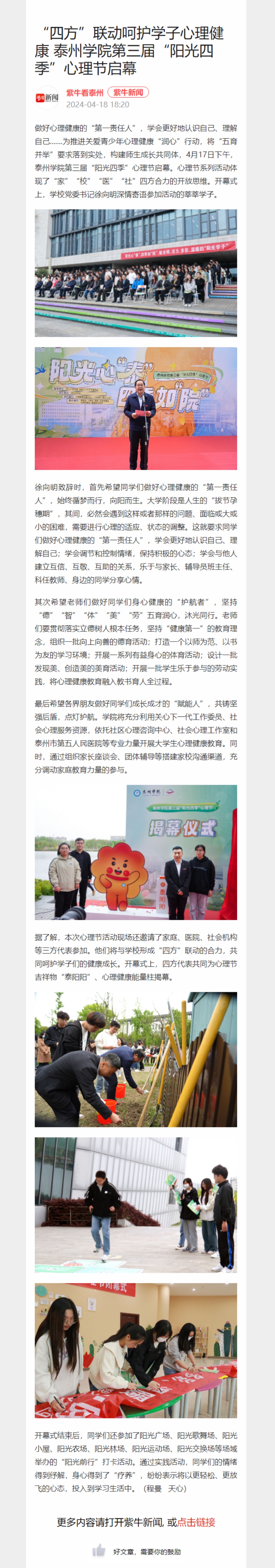 2024年4月18-20日,《学习强国》《江苏教育发布》《紫牛新闻》《泰州日报》《泰州晚报》等多个媒体平台报道bat365第三届“阳光四季”心理节活动。报道链接如下: