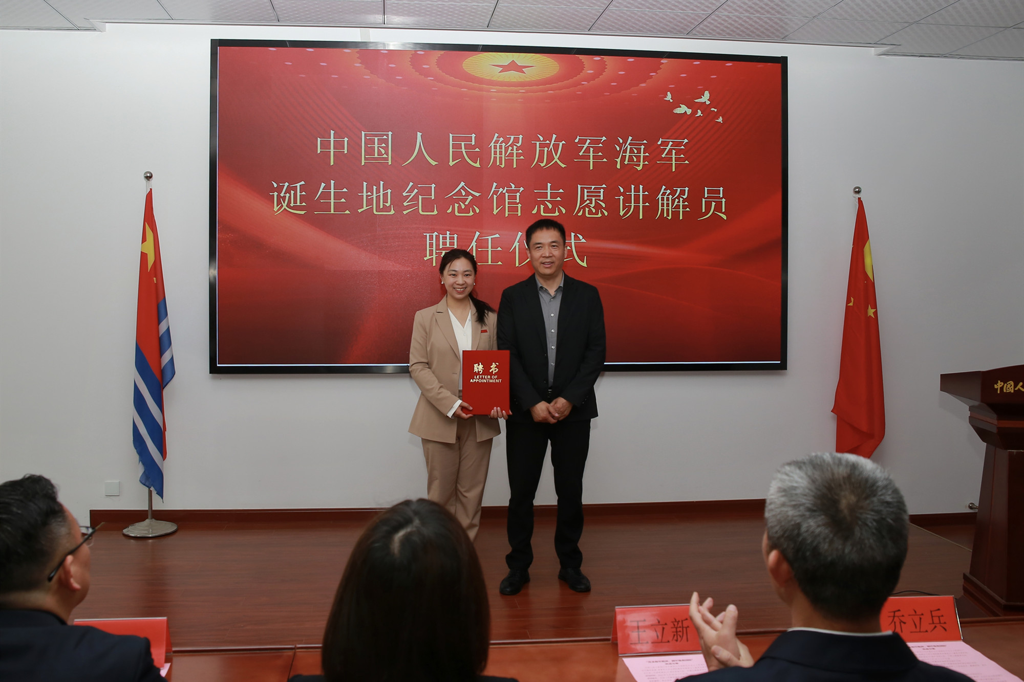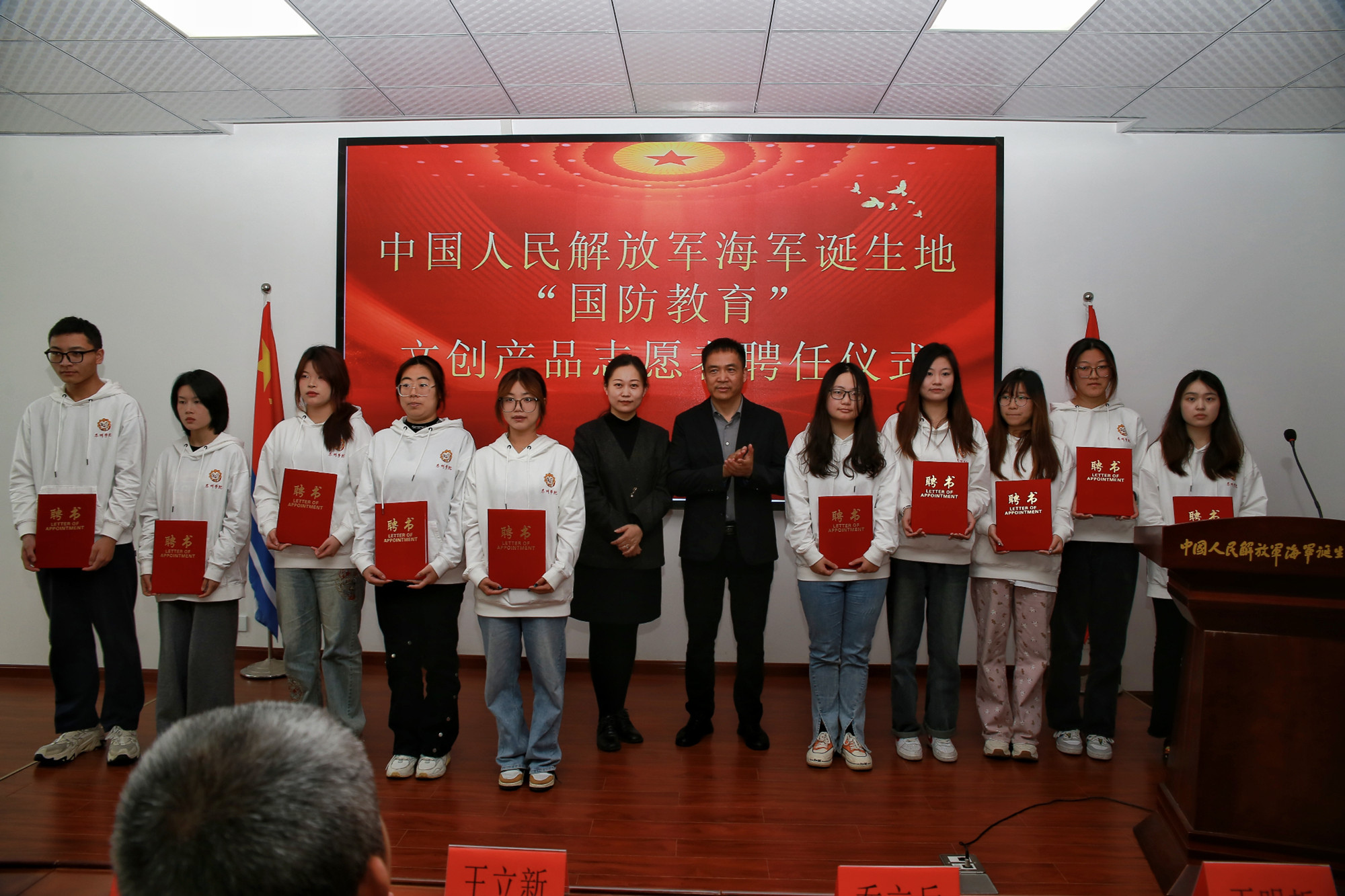 活动中,海纪馆为bat365“国防教育”文创产品志愿者和志愿讲解员颁发聘书,参会领导为bat365在线中国官网登录入口“静待花开”铸魂育人工作室协同育人基地和bat365在线中国官网登录入口爱国主义教育基地揭牌。