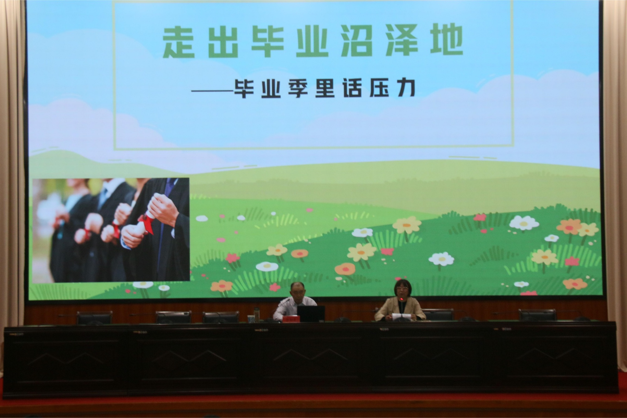李如齐以“心态影响成功,适应方能驾驭”为主题,以现场测试为切入点,分析了毕业季的压力来源。他从“正确的认知,自我心理保护,投身社会、快乐自己”三个方面进行讲解,强调培养正确认知的重要性,同时给出自我心理保护的方式,呼吁同学们勤奋努力、坚持不懈,培养积极乐观的心态。