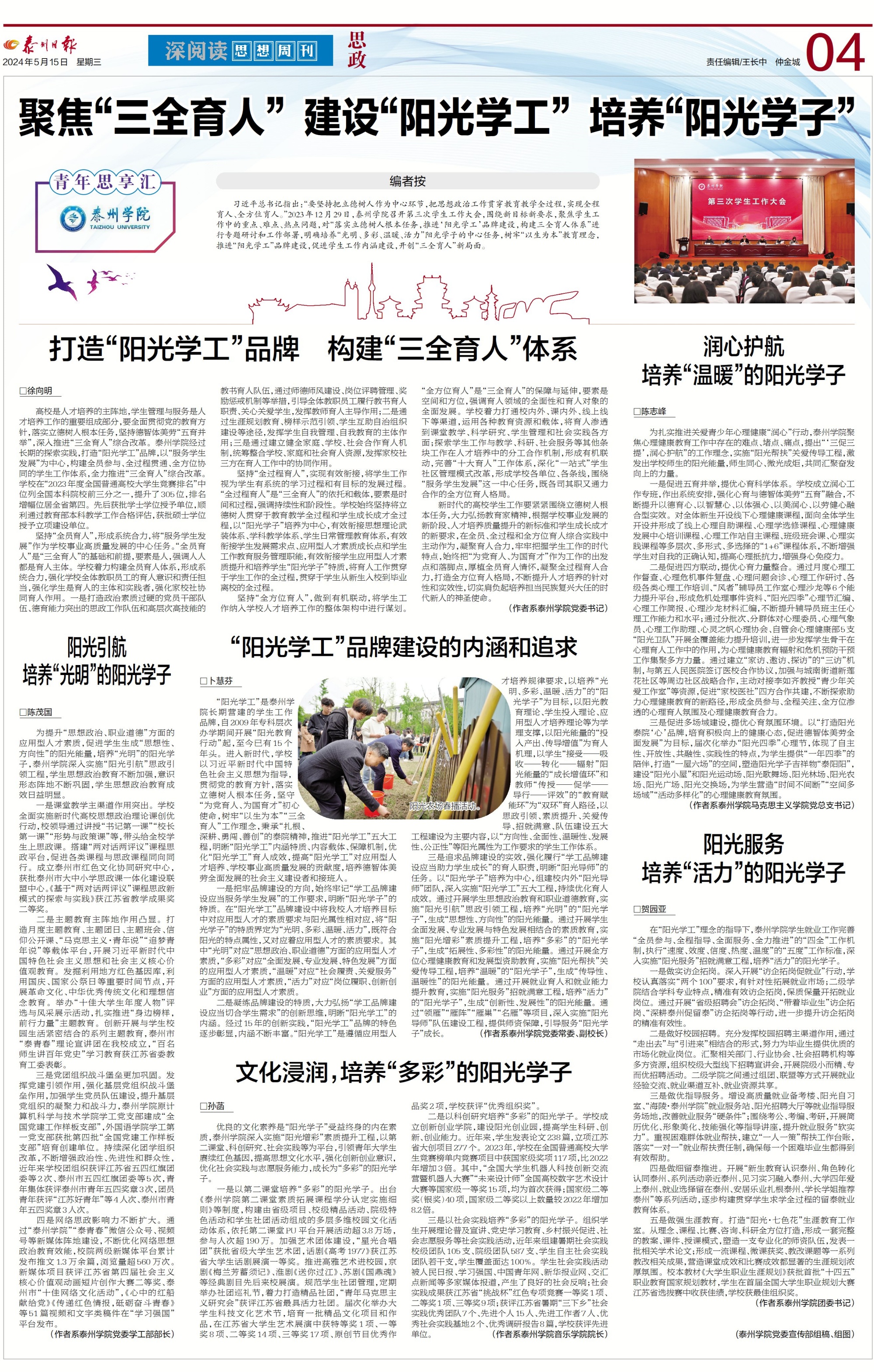 2024年5月15日,《泰州日报》第A04版思政专题报道bat365阳光学工工作,题为《聚焦“三全育人” 建设“阳光学工” 培养“阳光学子”》。