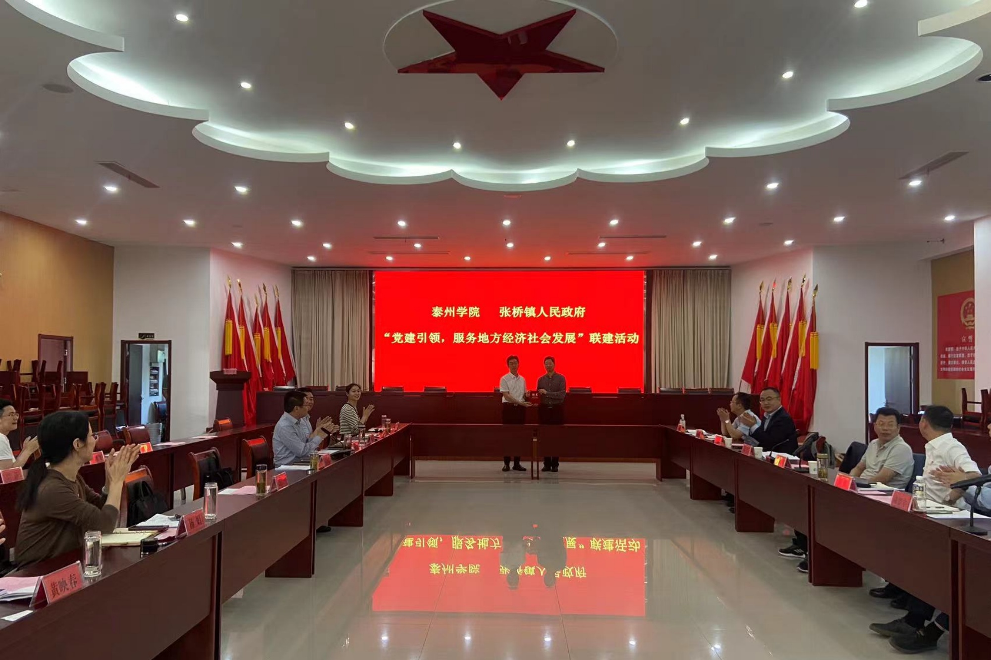 5月16日下午,经济与管理学院党总支书记黄彬、院长朱军带领数字经济、旅游管理专业教师党员,赴泰兴市张桥镇开展“党建引领,校地共建,服务地方经济社会发展”活动。活动由张桥镇党委副书记、镇长杨炳庚主持,张桥镇党委、政府领导班子全体成员参加活动。
