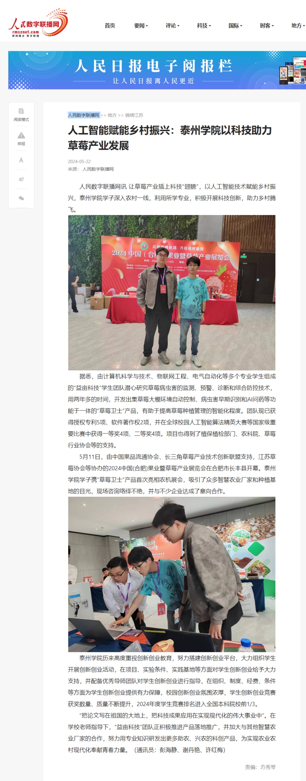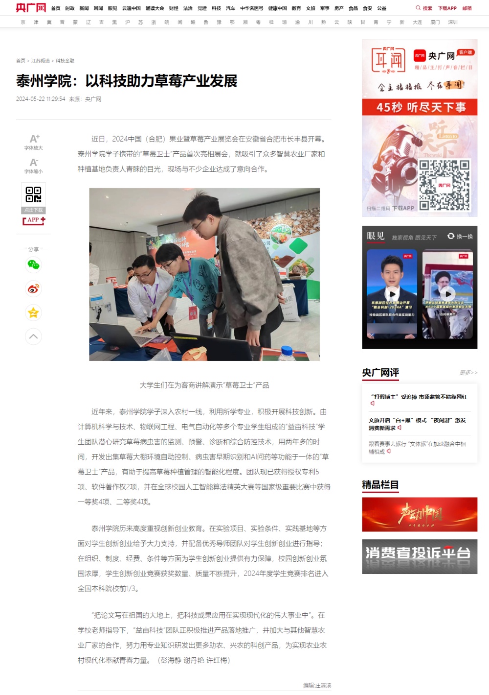 2024年5月22日,《人民数字联播网》《央广网》分别报道bat365以科技助力草莓产业发展。