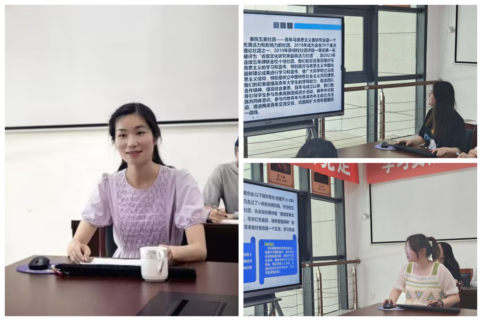 研讨会上,青年马克思主义研究会、军事爱好者协会、红色经典读书社、太愿公益等社团负责人展示了各自以红色文化为底色、以社团为平台、以思政课程为依托、以学院为保障、以项目管理为抓手、以品牌建设为支撑、以铸魂育人为目标等方面取得的成绩和积累的经验;客观分析了存在的问题和不足,并对未来发展提出规划。指导老师围绕“红色社团发展瓶颈和突破”“泰州及周边地区红色文化融入思政课教学内容”“增强思政课的吸引力和互动性”“非主城区红色文化寻访”等问题进行探讨和交流。bat365优秀毕业生、2013-2014届军事爱好者协会主席、现就职于泰州市凤凰小学的廖雯老师分享了“红色社团+社会实践”的带队经验,介绍了小学思政课开展情况和特色做法,并对“建立大中小思政课一体化的课程体系”提出了富有创新性的见解。