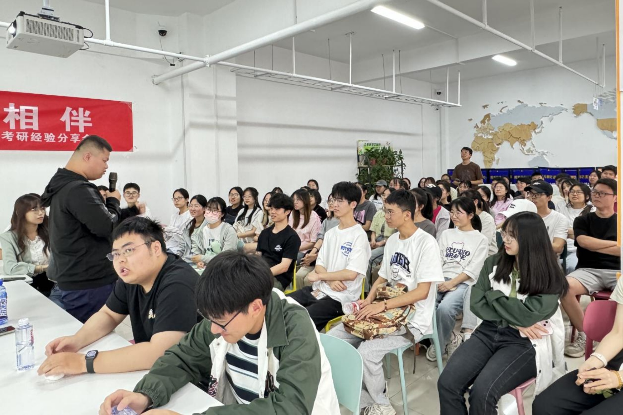 在交流互动环节,同学们结合自身情况,提出现阶段遇到的问题和困惑。在场老师、学长耐心地做了解答,并推荐优秀的教辅资料和学习平台供大家参考。