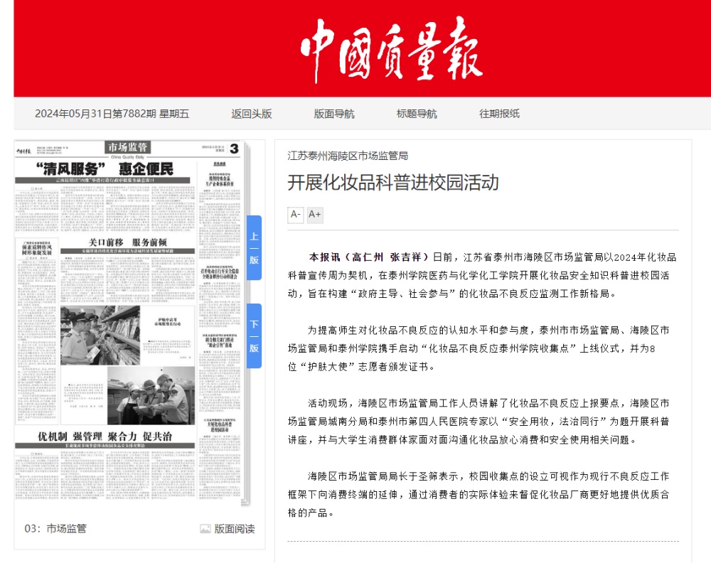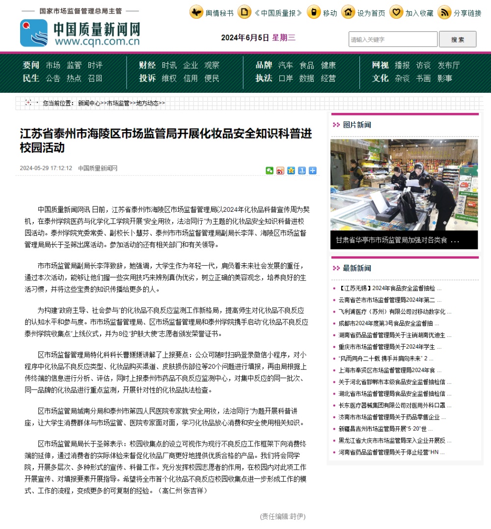 2024年5月29日《中国质量新闻网》,31日《中国质量报》3版市场监管报道《江苏泰州海陵区市场监管局开展化妆品科普进校园活动》。