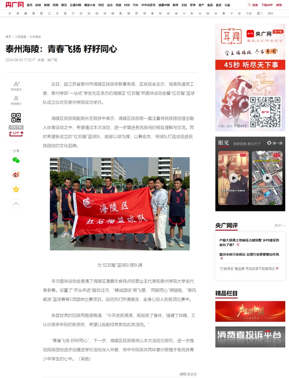 《央广网》2024年6月3日报道在bat365举办的海陵区“红石榴”杯趣味运动会暨“红石榴”篮球队成立仪式,报道题为:《泰州海陵:青春飞扬 籽籽同心》,报道链接:https://js.cnr.cn/whly/20240603/t20240603_526728459.shtml