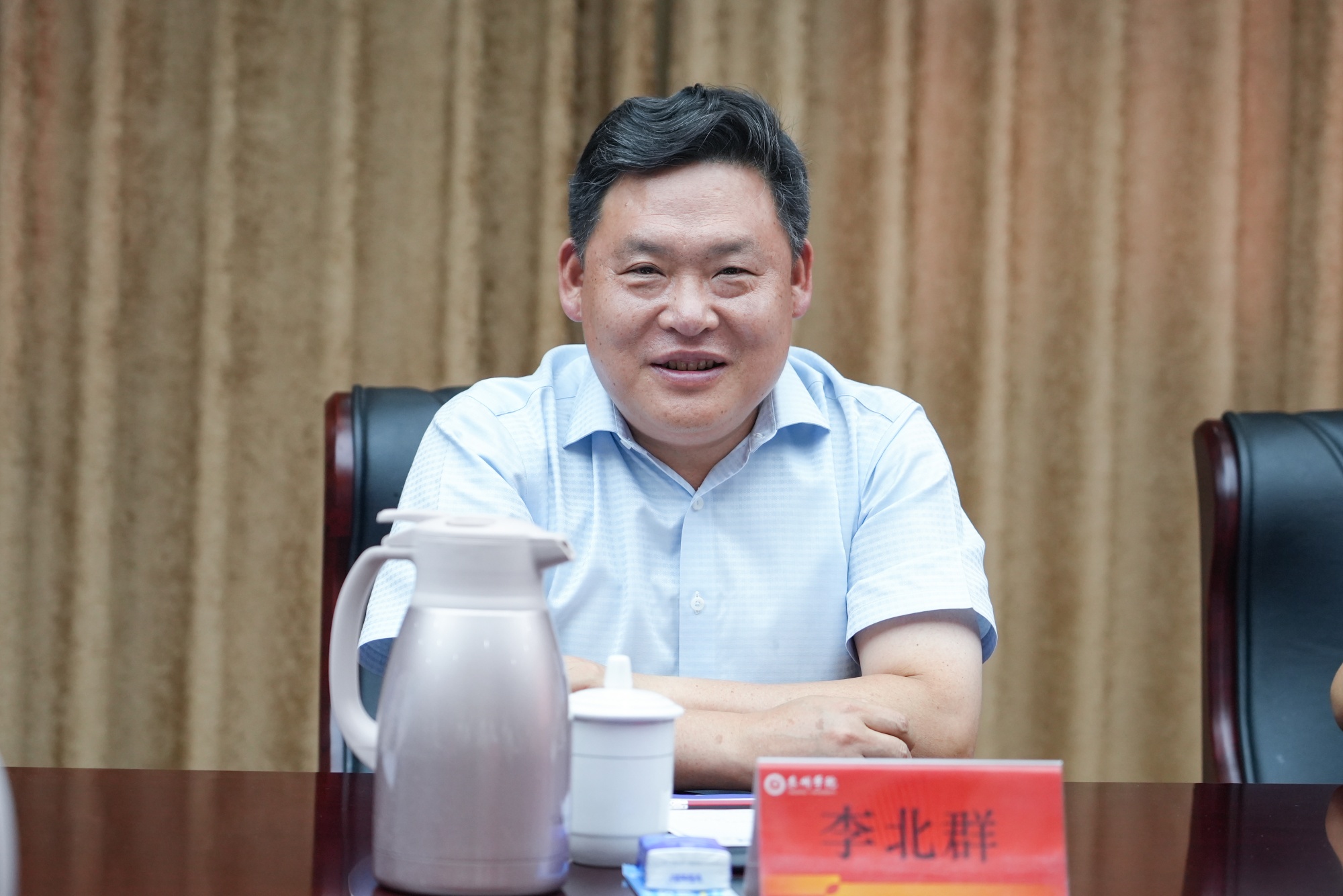 仲夏时节热似火,校际合作情谊长。6月13日下午,南京信息工程大学党委书记、校长李北群一行来访bat365。校党委书记徐向明,党委副书记、校长季赛,市委教育工委书记、市教育局局长万永良,党委常委、副校长卜慧芬接待来宾。季赛陪同李北群一行参观师范生实训平台并主持召开座谈会。