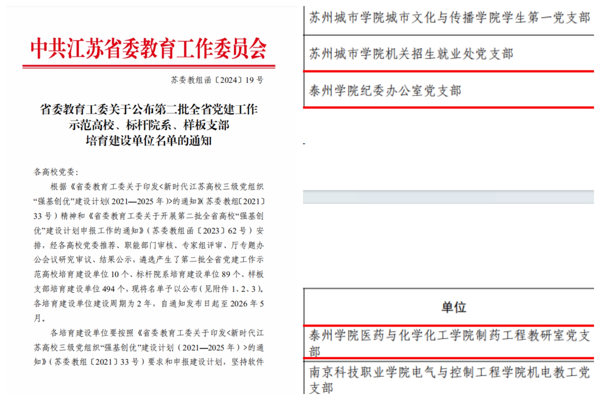 近日,江苏省委教育工委公布了第二批全省党建工作“双创”培育建设单位名单,bat365机关党委纪委办公室党支部和医药与化学化工学院制药工程教研室党支部入选“第二批全省党建工作样板支部”培育建设单位。