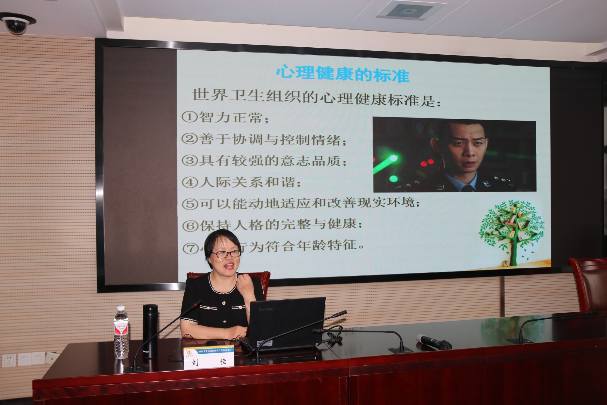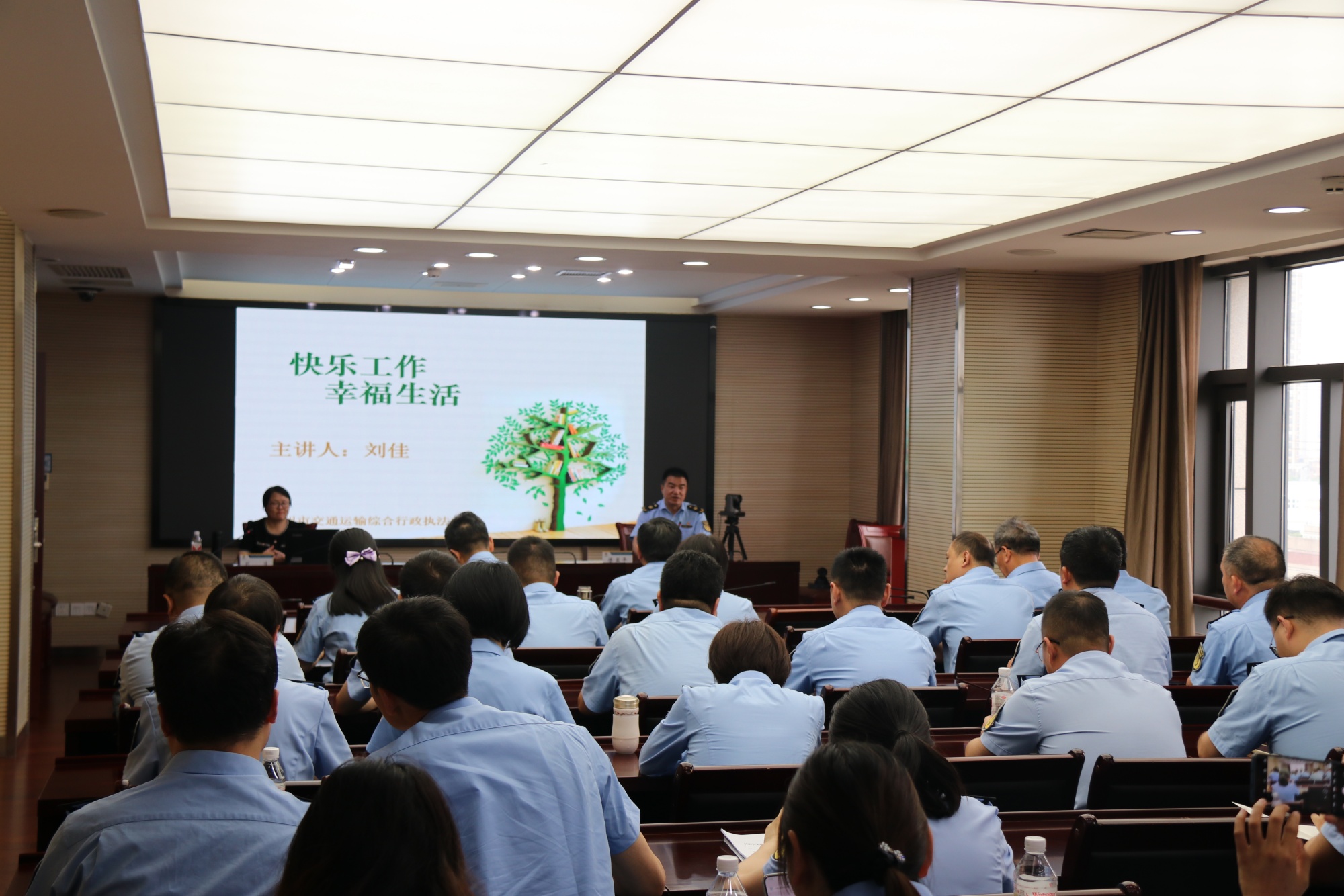 调研结束后,心理学教研室刘佳副教授为该支队干部职工作了题为“快乐工作 幸福生活”的专题讲座,支队副支队长、四级调研员陈亚平主持讲座。讲座中,刘佳先从心理健康的标准入手,探讨了压力存在的原因、表现及应对策略。在快乐工作板块中,刘佳分享了如何从情绪和情感角度调整个人心态,探讨了改变对工作的态度、提升工作意义、改善工作环境、调整目标、平衡工作与生活、享受工作成就感等六个方面的方法释放压力,从而实现愉悦工作的目标。