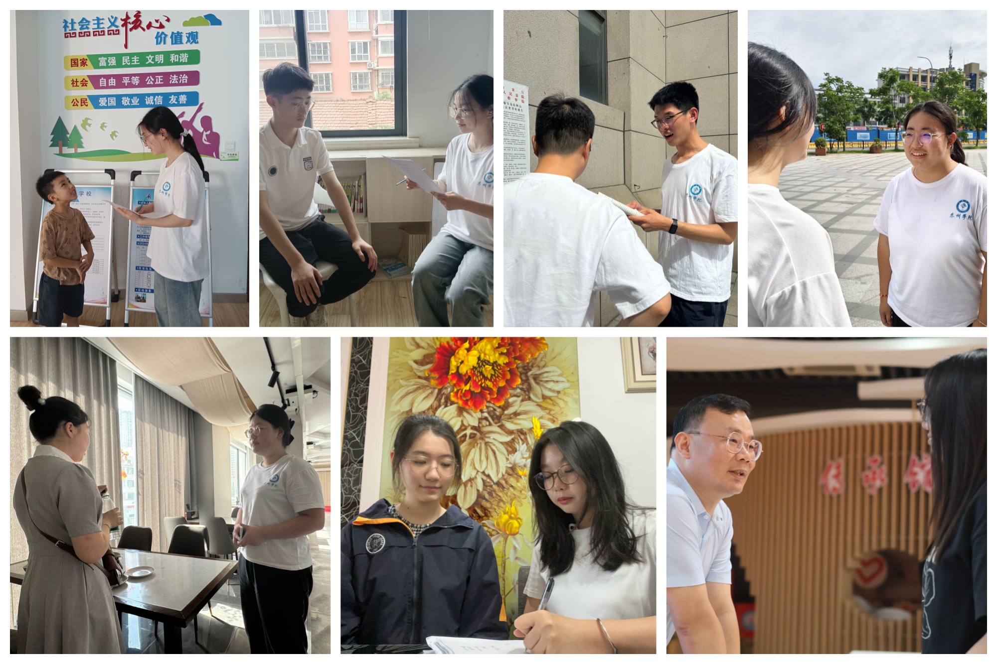 调研过程中,团队成员无惧炎炎烈日,积极主动联系相关学校、老师、同学,通过师生访谈、课堂教学观摩、实地走访、乡村助学等形式深入了解当前大中小学校思政课建设的实际情况,搜集师生对于思政课一体化建设的困惑、意见和建议,探究思政课在不同学段的教学内容、教学方法、评价体系等方面的衔接与融合。在泰州市凤凰初级中学,学生分享了自己在思政课学习过程中发生的感人故事;在扬州市江都区实验小学,团队成员通过采访思政教师,了解到该校在思政课一体化专题培训、校级培训以及各类教学研讨会的开展情况;在盐城、南通、连云港等地,队员们与校领导、思政教师、中小学学生共同探究思政课教学目标设计、课程设置、教材编写、教学改革、教师培养、考核评价等问题。