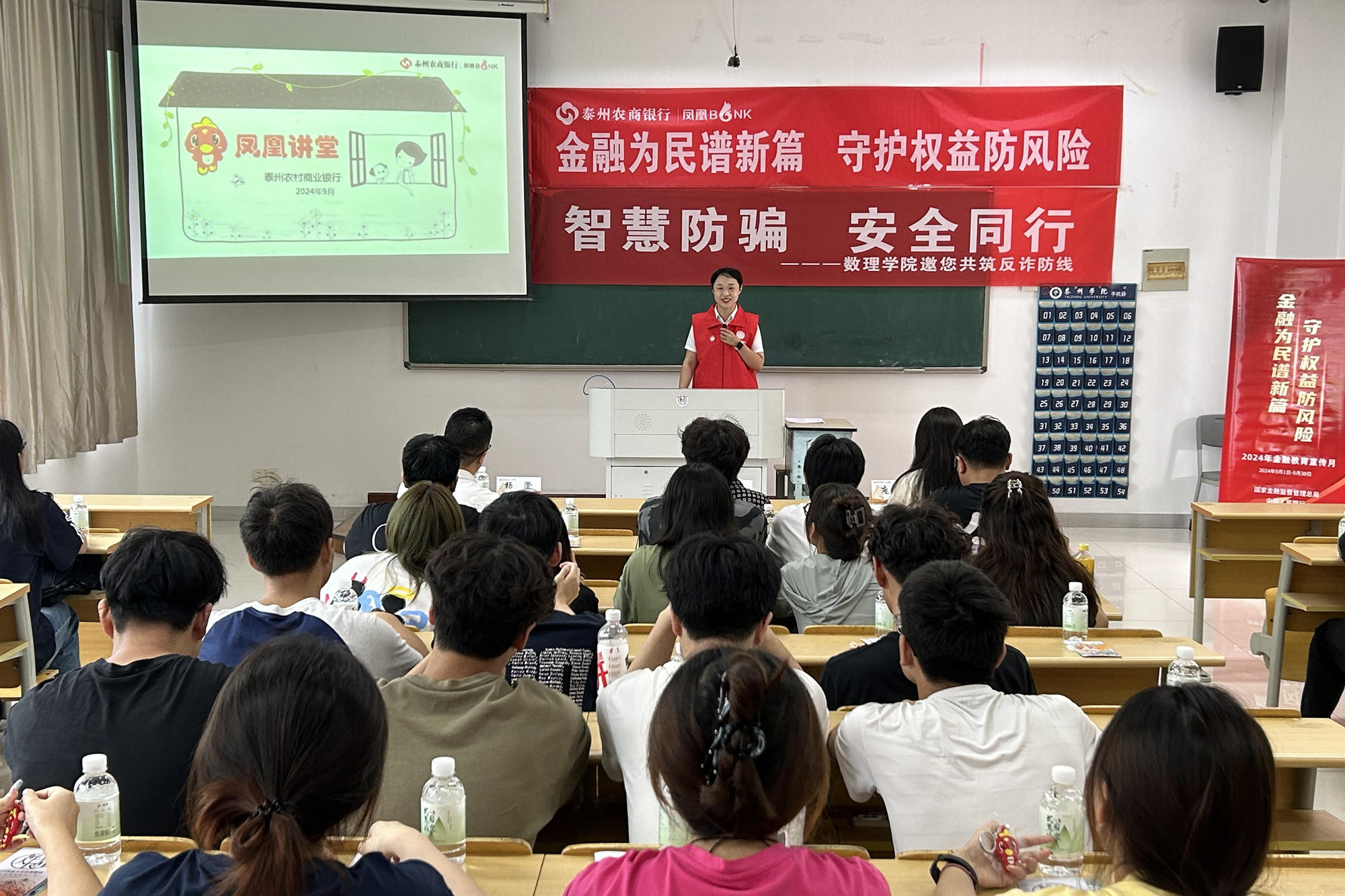 9月6日下午,数理学院在教学楼A3102开展以“金融为民谱新篇,守护权益防风险”为主题的活动。泰州农村商业银行行长助理杨澄、数理学院党总支副书记赵云、数理学院团总支书记庞静以及2023级全体统计专业同学参加了本次活动。