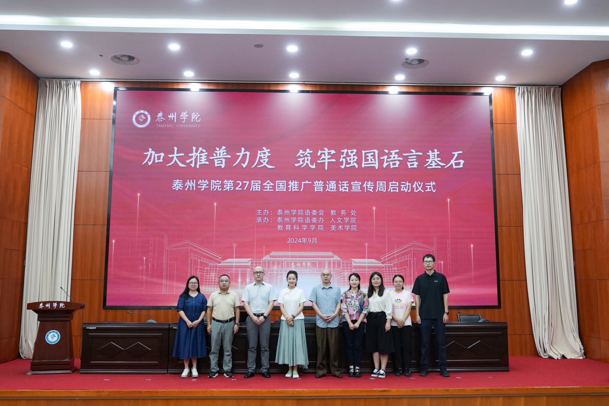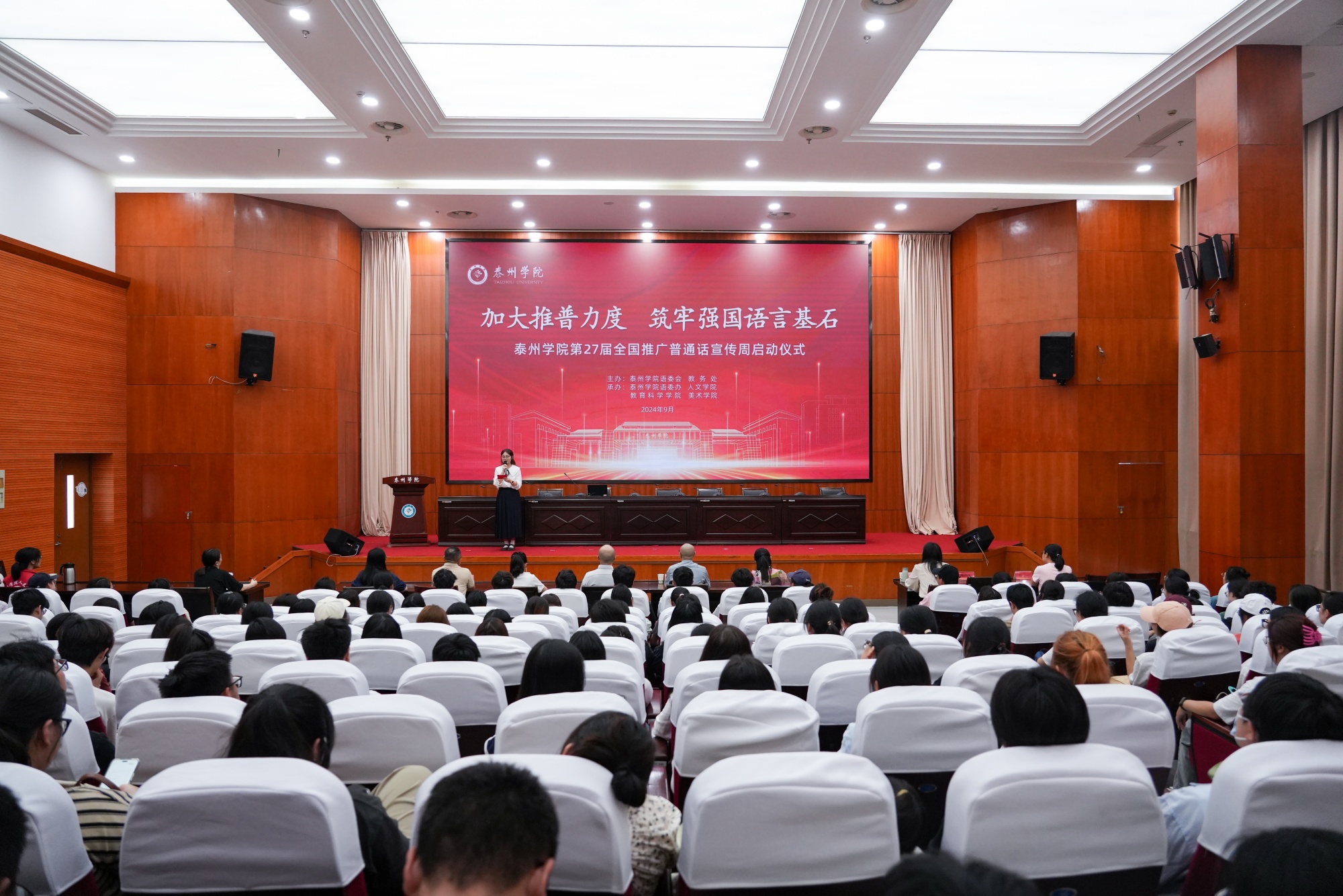 为增强全校师生的语言规范意识和推普参与意识,9月18日下午,bat365在行政楼D1216会议室举行了推广普通话宣传周启动仪式。泰州市文联秘书长、国家级普通话水平测试员薛悠璐,教务处副处长季恒,人文学院领导班子,以及各二级学院师生代表共200余人参加了启动仪式。