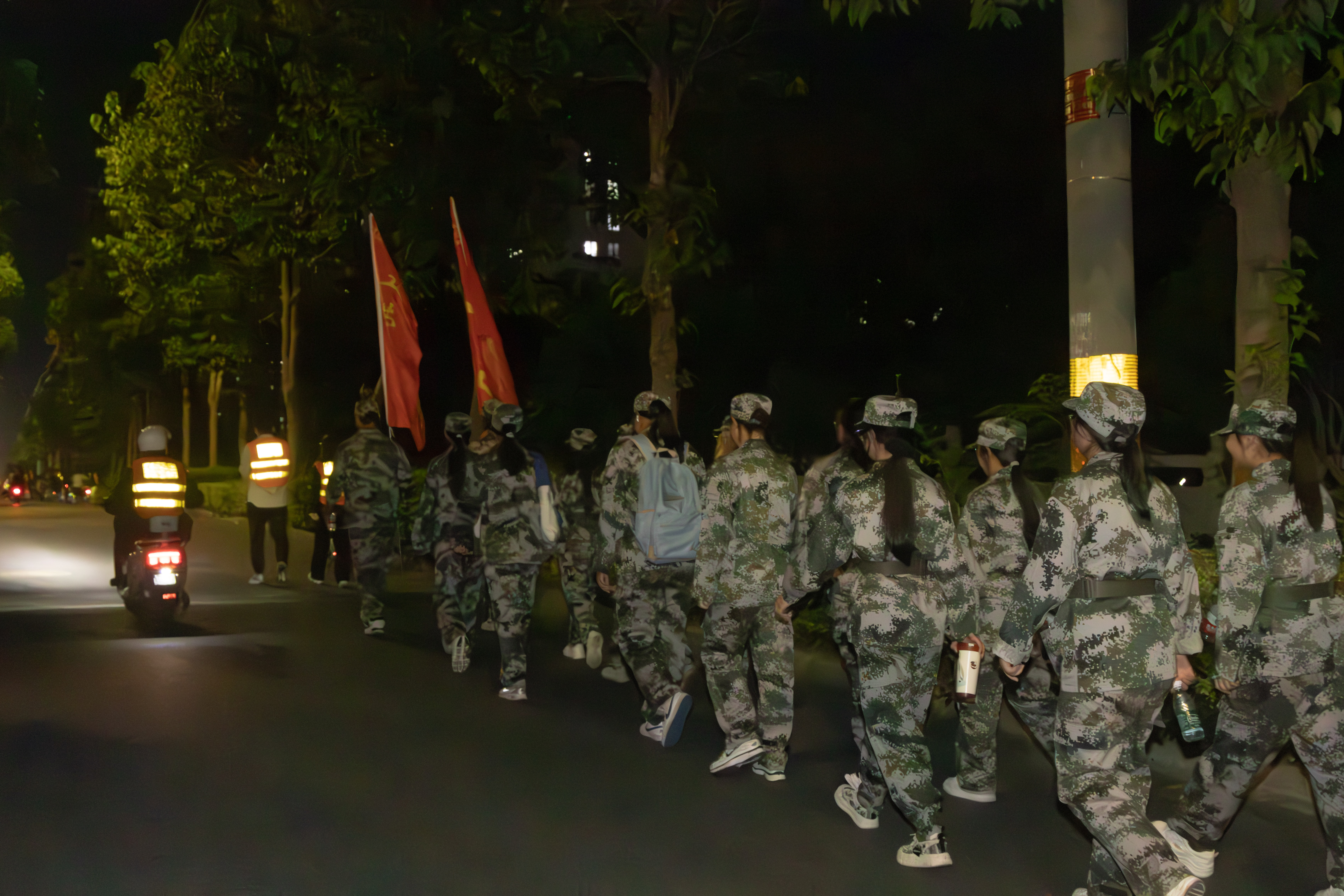 星光如月映长空,21时30分,各连队旗帜高高飘扬,新生按照拉练队形在图书馆门口迅速集合。随着校党委常委、副校长卜慧芬下达“出发”口令,同学们踏上军训拉练征程。