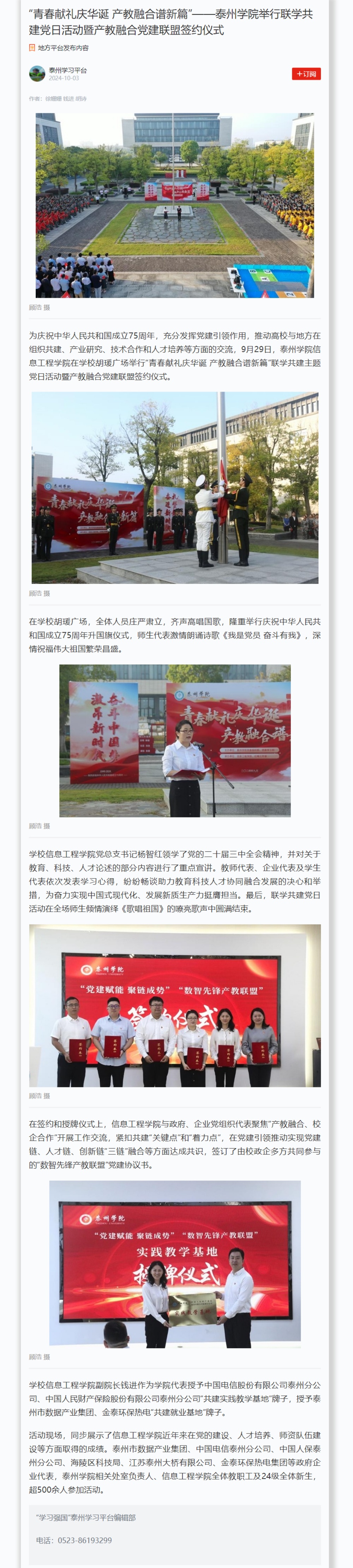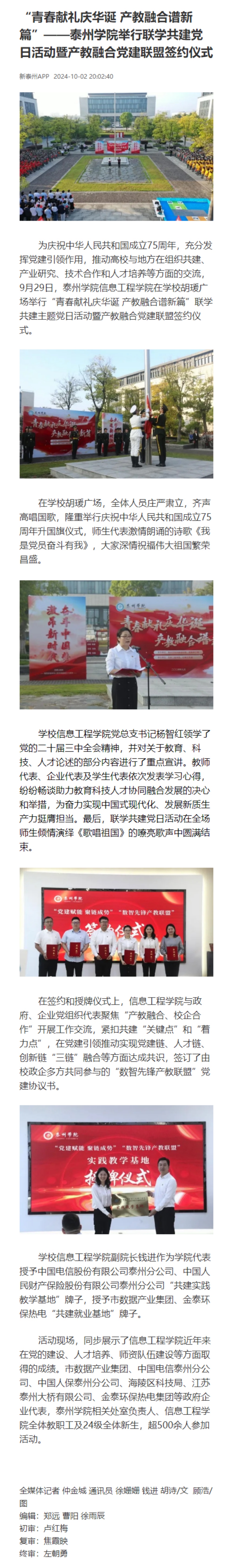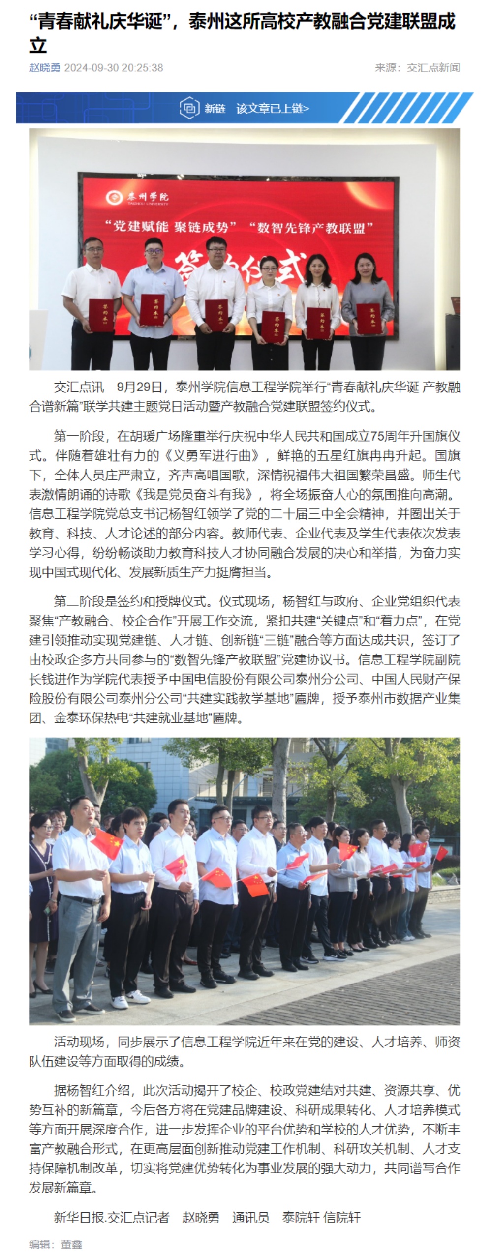 《交汇点新闻》《新泰州》《学习强国》2024年9月30日-10月3日分别报道bat365举行联学共建党日活动暨产教融合党建联盟签约仪式