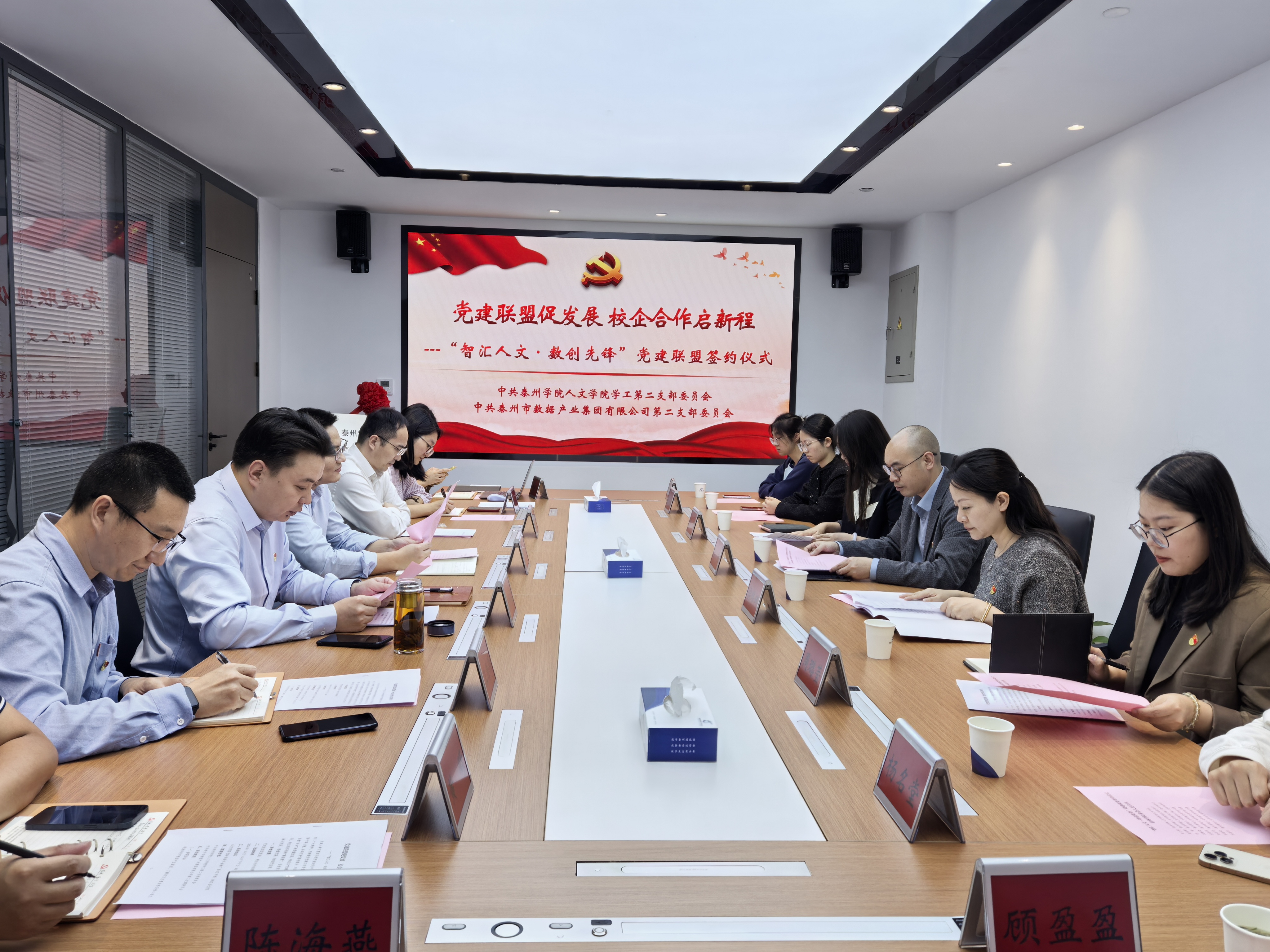 为强化党建引领作用,加快发展新质生产力,更好地服务地方经济、文化、产业发展,10月14日下午,bat365在线中国官网登录入口人文学院学工第二党支部与泰州市数据产业集团有限公司第二党支部举办“党建联盟促发展 校企合作启新程”——“智汇人文·数创先锋”党建结对共建仪式。人文学院党总支书记吴小荣、副书记侯维娜,泰州市数据产业集团党委副书记丁俊杰,城发数科副总经理李军、吴炳君以及双方党员代表参加活动。