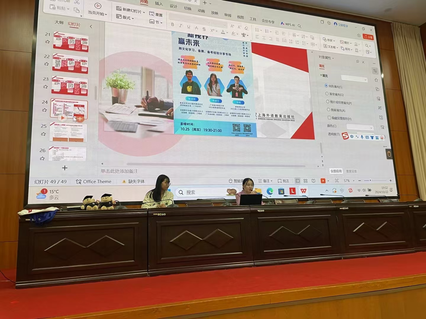10月22日晚,外国语学院邀请上海外语教育出版社跨文化能力测试中心柳源到bat365行政楼1216为全校学生进行全国跨文化能力考试宣讲。外国语学院副院长丁莉、跨文化交际课程任课教师石瑶、顾蒙和徐佳参加活动。